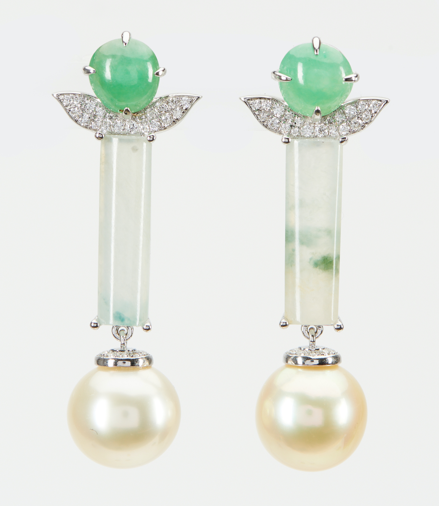 A PAIR OF SOUTH SEA PEARL, JADEITE AND DIAMOND EARRINGS - Each earring featuring a round pearl of cream hues measuring 10.0mm, suspended on an elongated domed pale green jade drop to a green jadeite and diamond set stud fitting, in 18ct white gold.