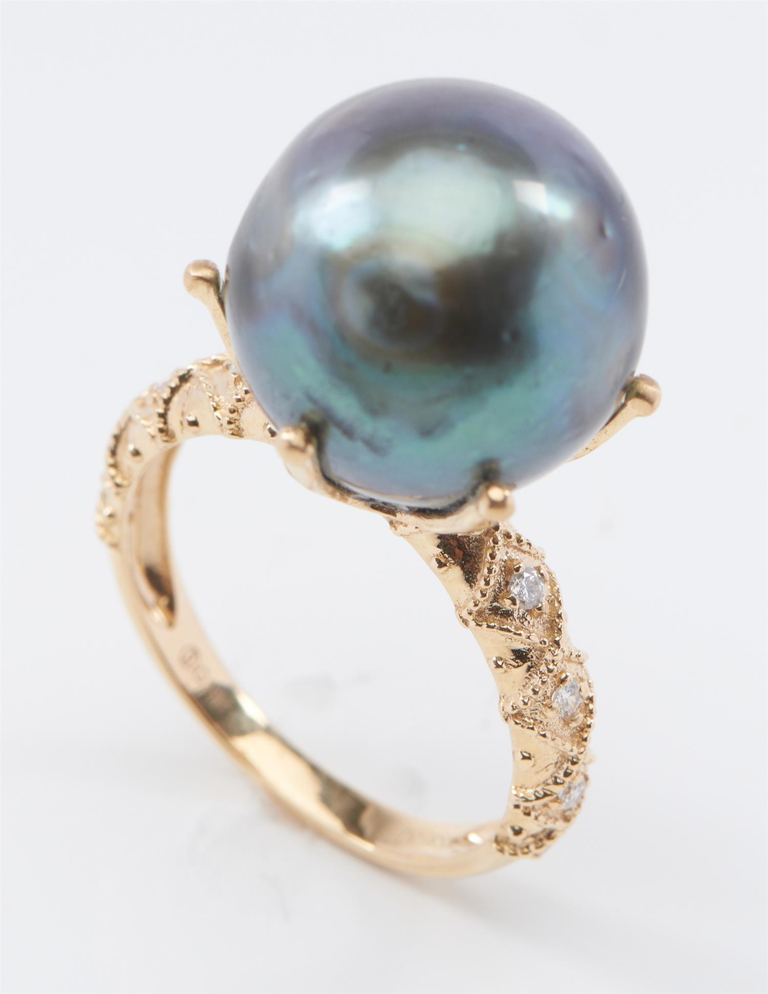 A TAHITIAN PEARL AND DIAMOND RING IN 18CT GOLD, CENTRALLY SET WITH A ROUND PEARL OF DARK GREY HUES MEASURING 13.8MM, WITHIN A DECORATIVE DIAMOND SET SHOULDERS, SIZE M, 7GMS