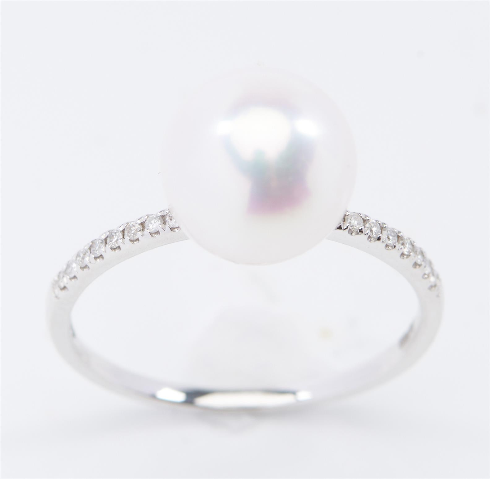 AN AKOYA PEARL AND DIAMOND RING - Featuring a round pearl of pink and white hues, measuring 9.20mm, within shoulders set with fine diamond detail, in 18ct white gold, ring size L.