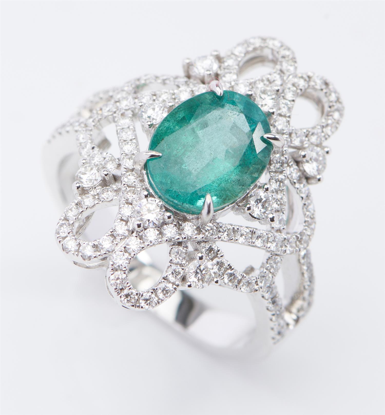 AN EMERALD AND DIAMOND RING IN 18CT WHITE GOLD, CENTRALLY SET WITH AN OVAL CUT EMERALD OF 2.14CTS, WITHIN A DECORATIVE PIERCED SURROUND SET WITH DIAMONDS TOTALLING 0.87CT, SIZE N, 5.7GMS