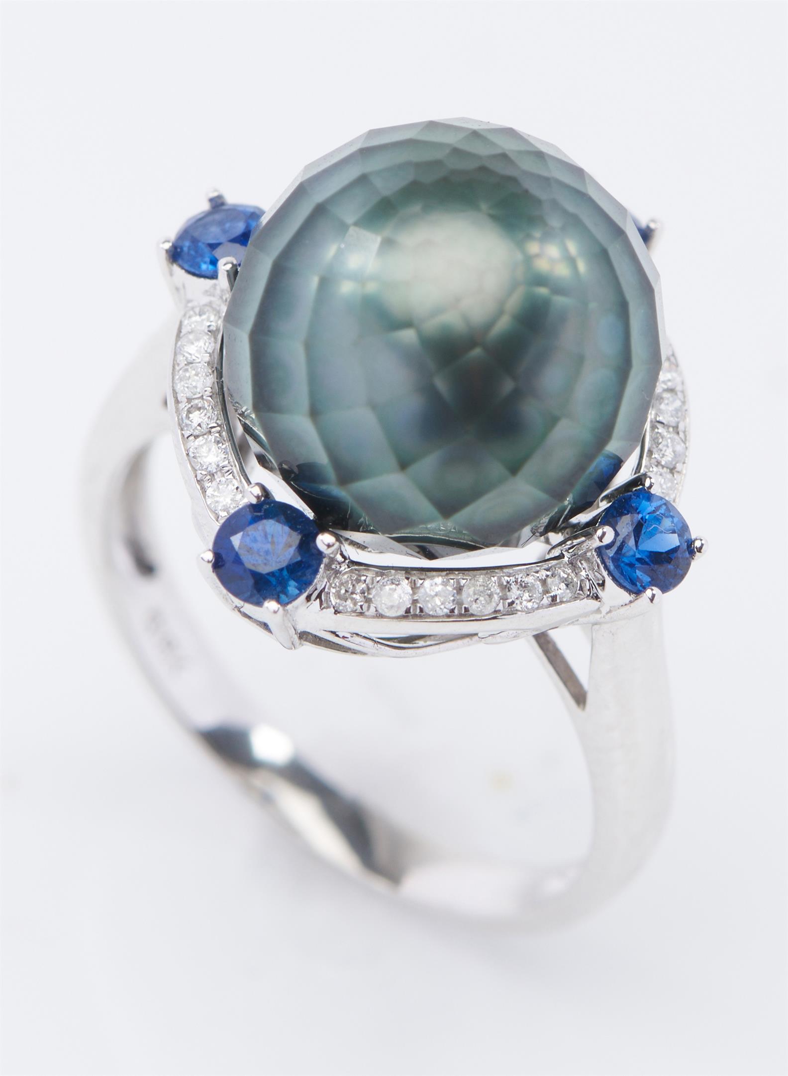 A TAHITIAN PEARL, SAPPHIRE AND DIAMOND RING IN 18CT WHITE GOLD, CENTRALLY SET WITH A FACETER PEARL OF 11.6MM, SURROUNDED BY DIAMONDS AND BLUE SAPPHIRES, SIZE L, 5.1GMS