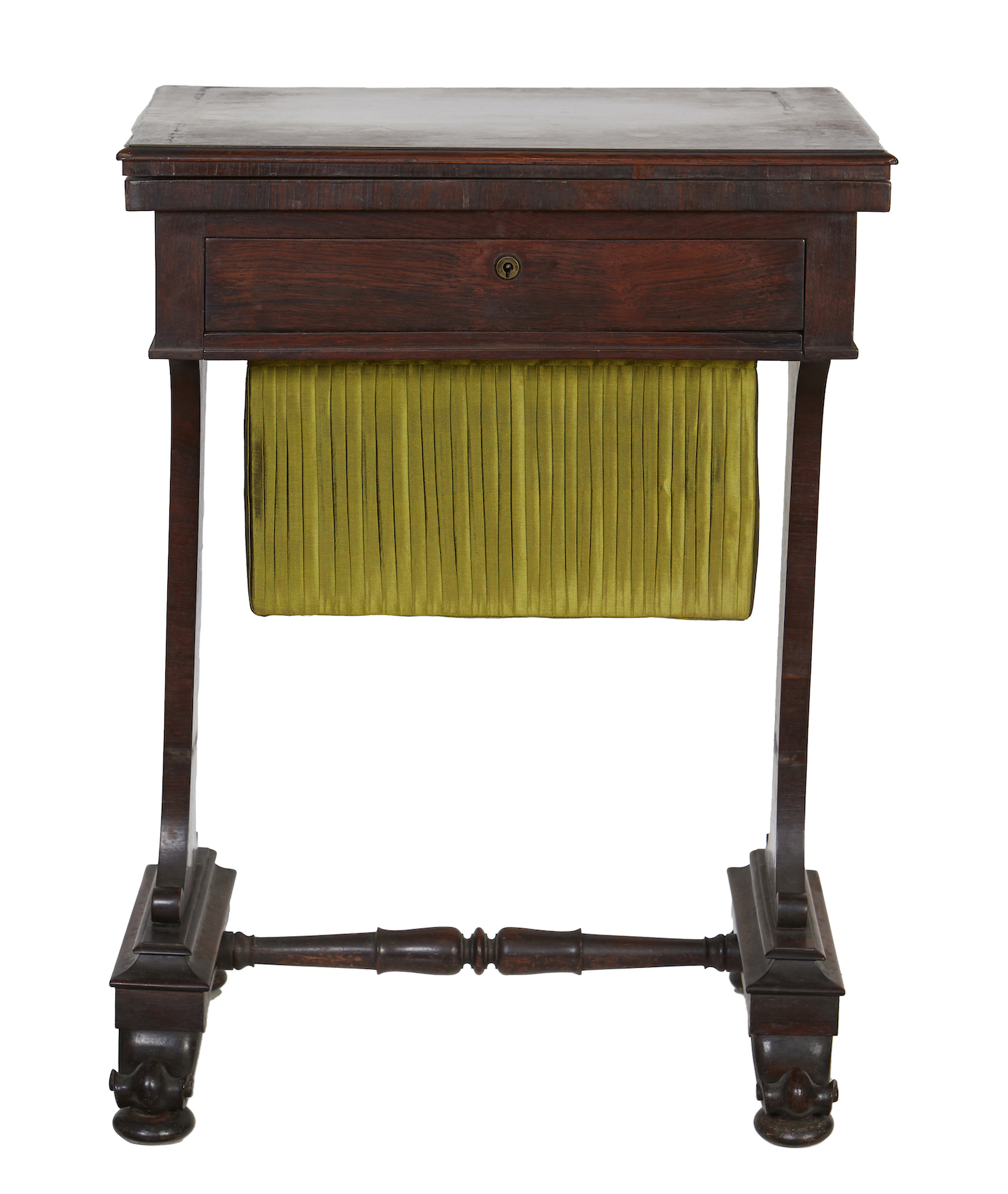 The flap top revealing a chess board. With single drawer above a pull-out work bin. On column supports, stretched base on four scroll feet.