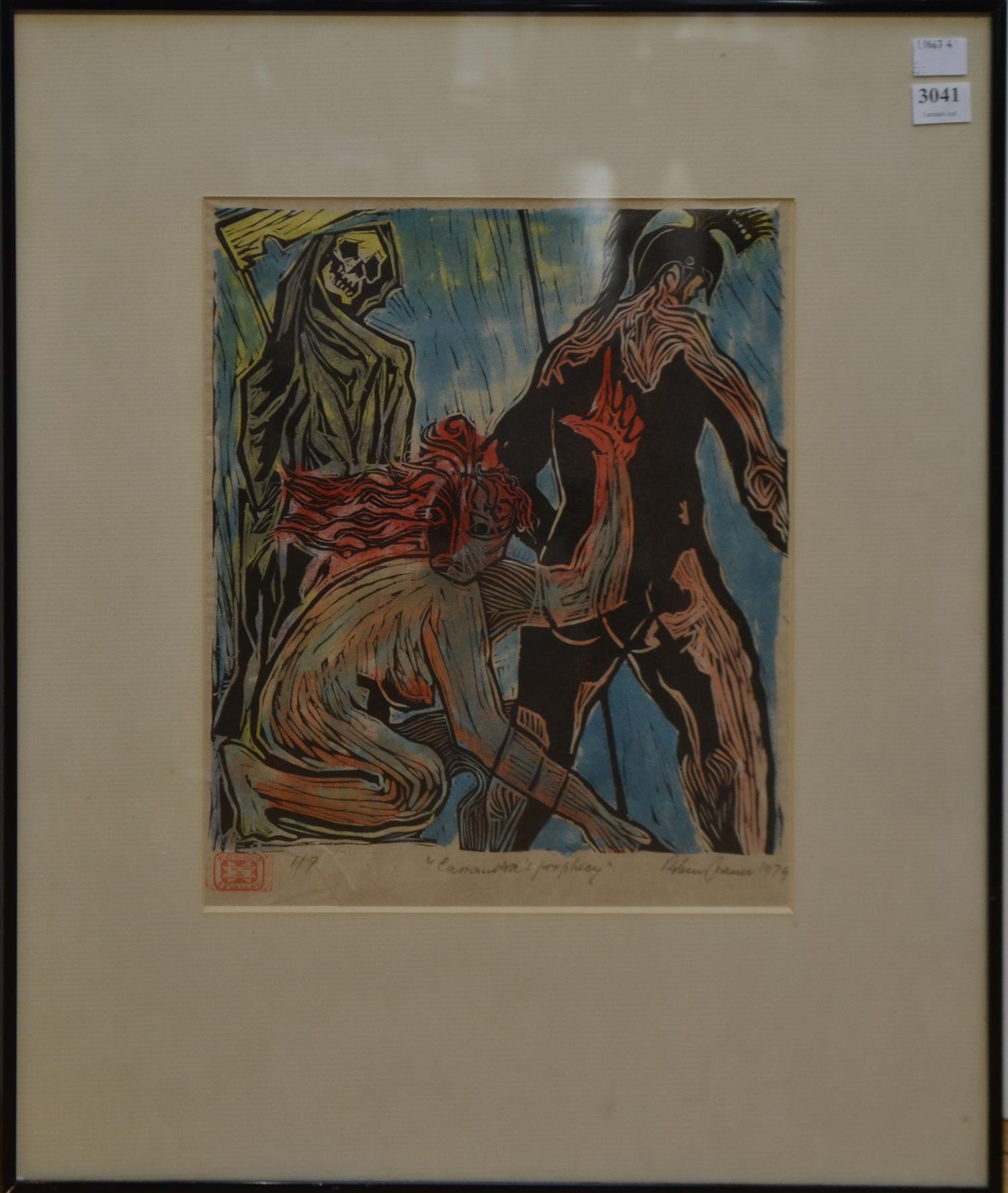 ROBERT TRAUER, PROPHECY 1974, LINOCUT 1/7, 28 X 25CM, FRAME SIZE: 53 X 44CM, CONDITION: CREASING AND COCKLING TO PAPER, LIGHT DISCOLOURATION