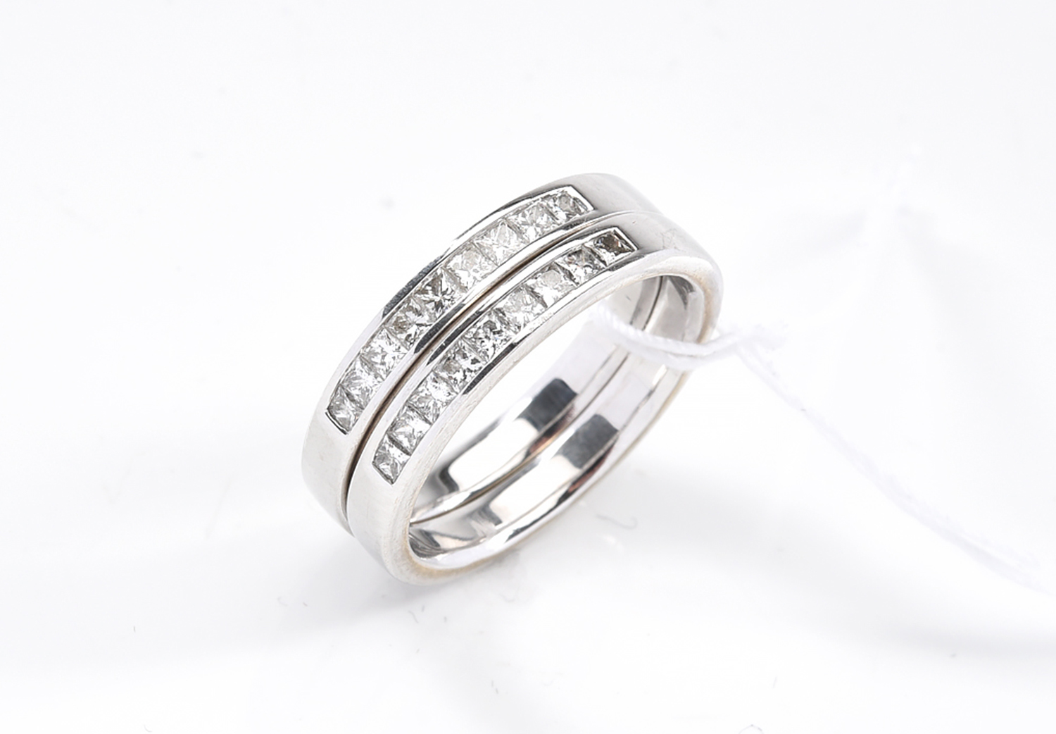 TWO DIAMOND HALF HOOP BANDS IN 18CT WHITE GOLD, SIZE L, 6.7GMS