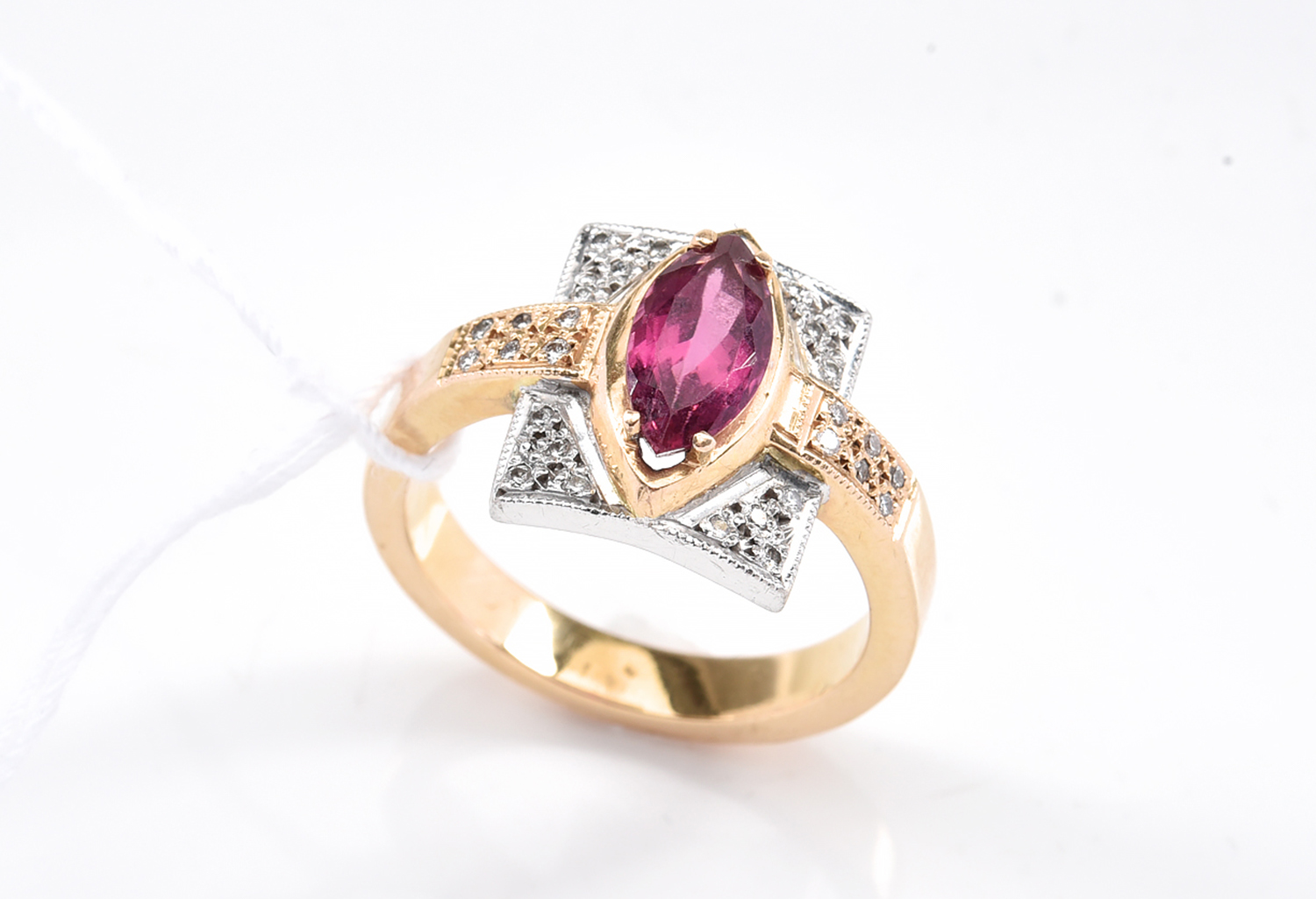 A 1980s STYLE GEMSET RING IN 18CT TWO TONE GOLD, SIZE O, 9GMS