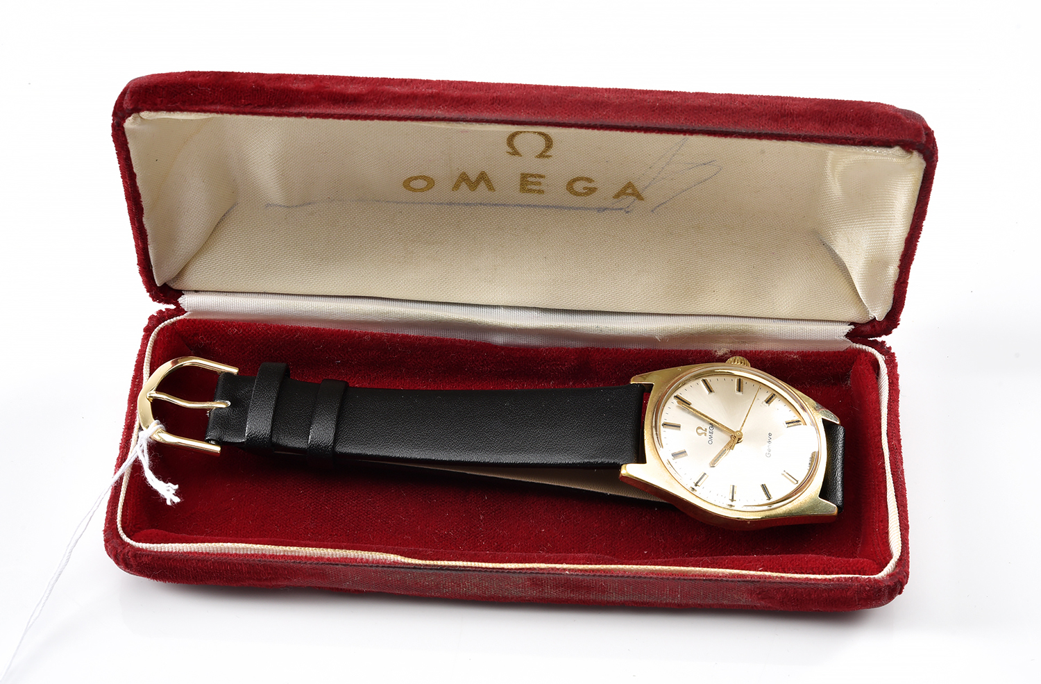 A VINTAGE OMEGA GENEVE WRISTWATCH, MANUAL WIND, ROUND DIAL DIAMETER 33MM, TO BLACK LEATHER BANDS, BOXED