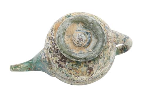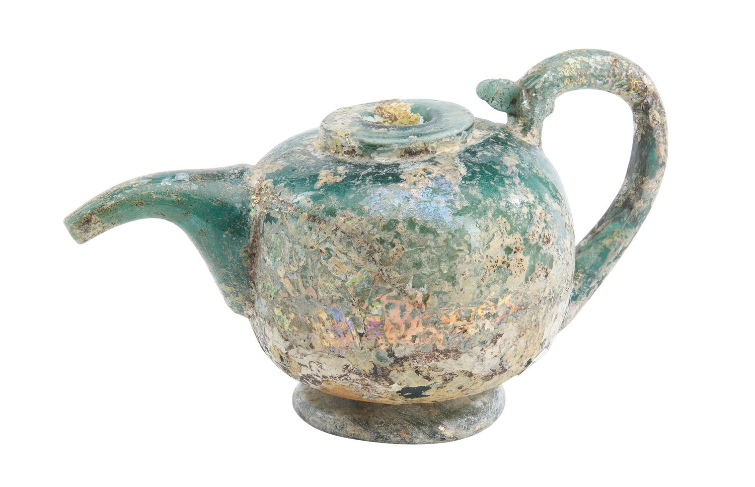 The ancient translucent iridescent glass pot with loop handle and curved spout.