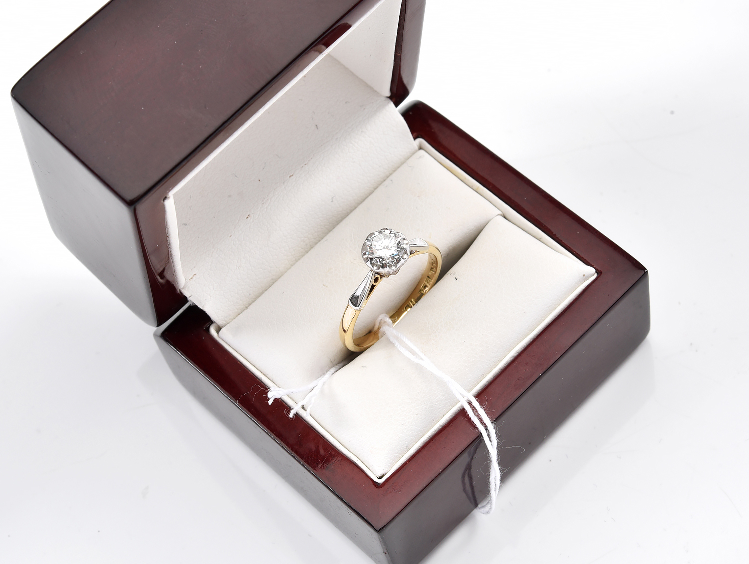 A SOLITAIRE DIAMOND RING OF APPROXIMATELY 0.60CTS, IN 18CT GOLD AND PALLADIUM, SIZE K, 2.7GMS