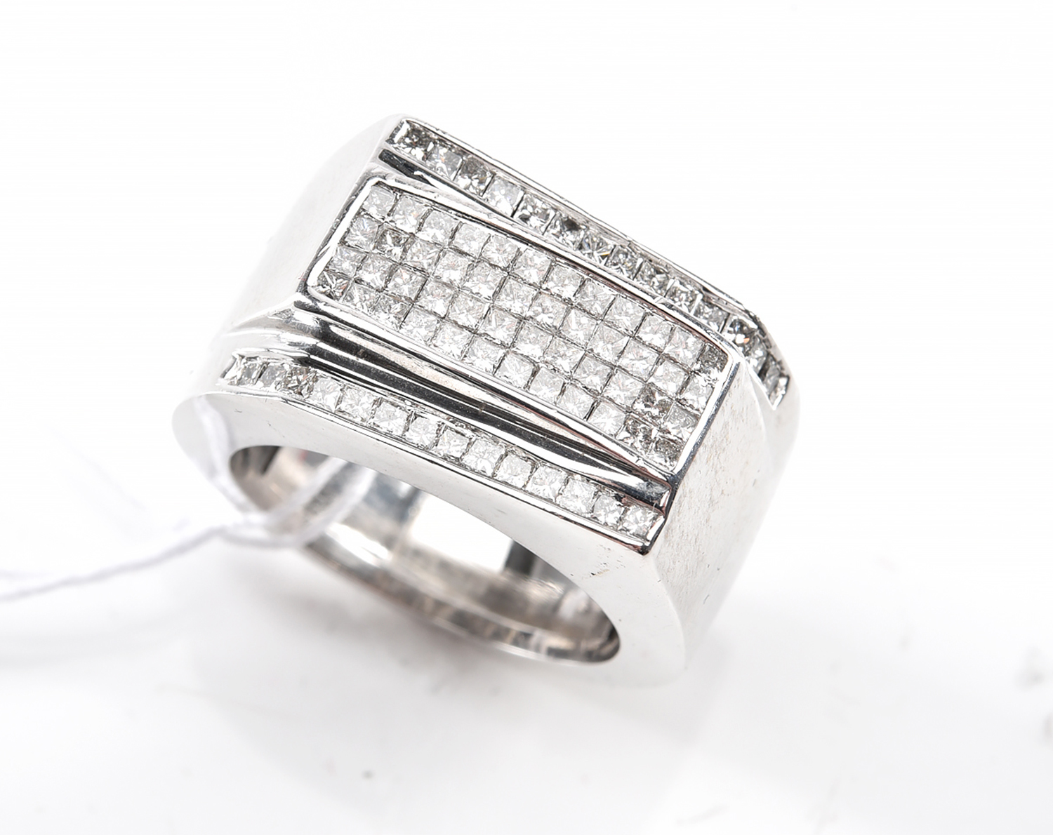 A GENTLEMAN'S CHANNEL AND INVISIBLY SET DIAMOND RING IN 14CT WHITE GOLD, RING SIZE M - O, 14.9GMS