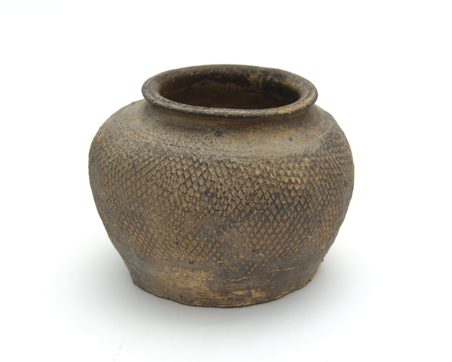 Of compressed baluster form, decorated to the sides with impressed woven cloth marks.