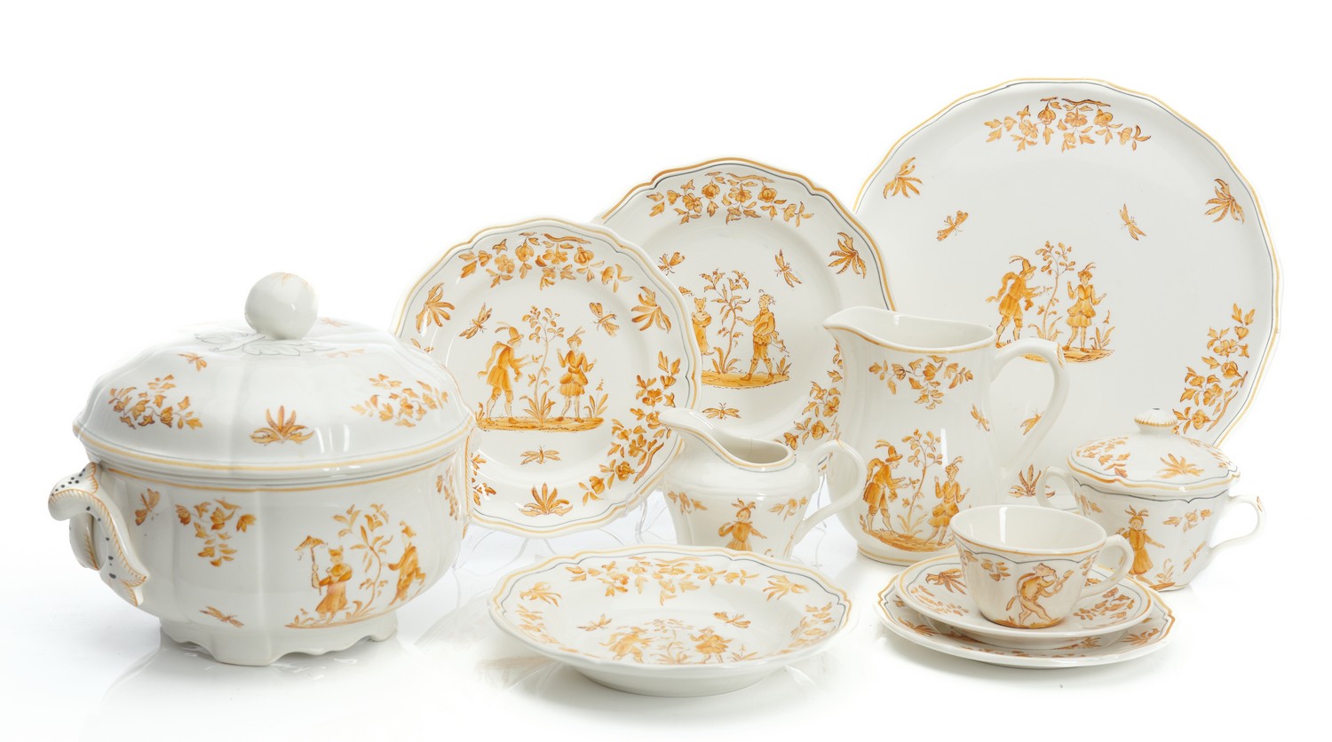 Comprising a 20 main plates, 18 entree plates, 22 soup bowls, 19 side dishes, 9 tea cups and 17 saucers, a large circular serving platter, a lidded tureen, oblong serving platter, sugar bowl, creamer, pitcher and a serving bowl