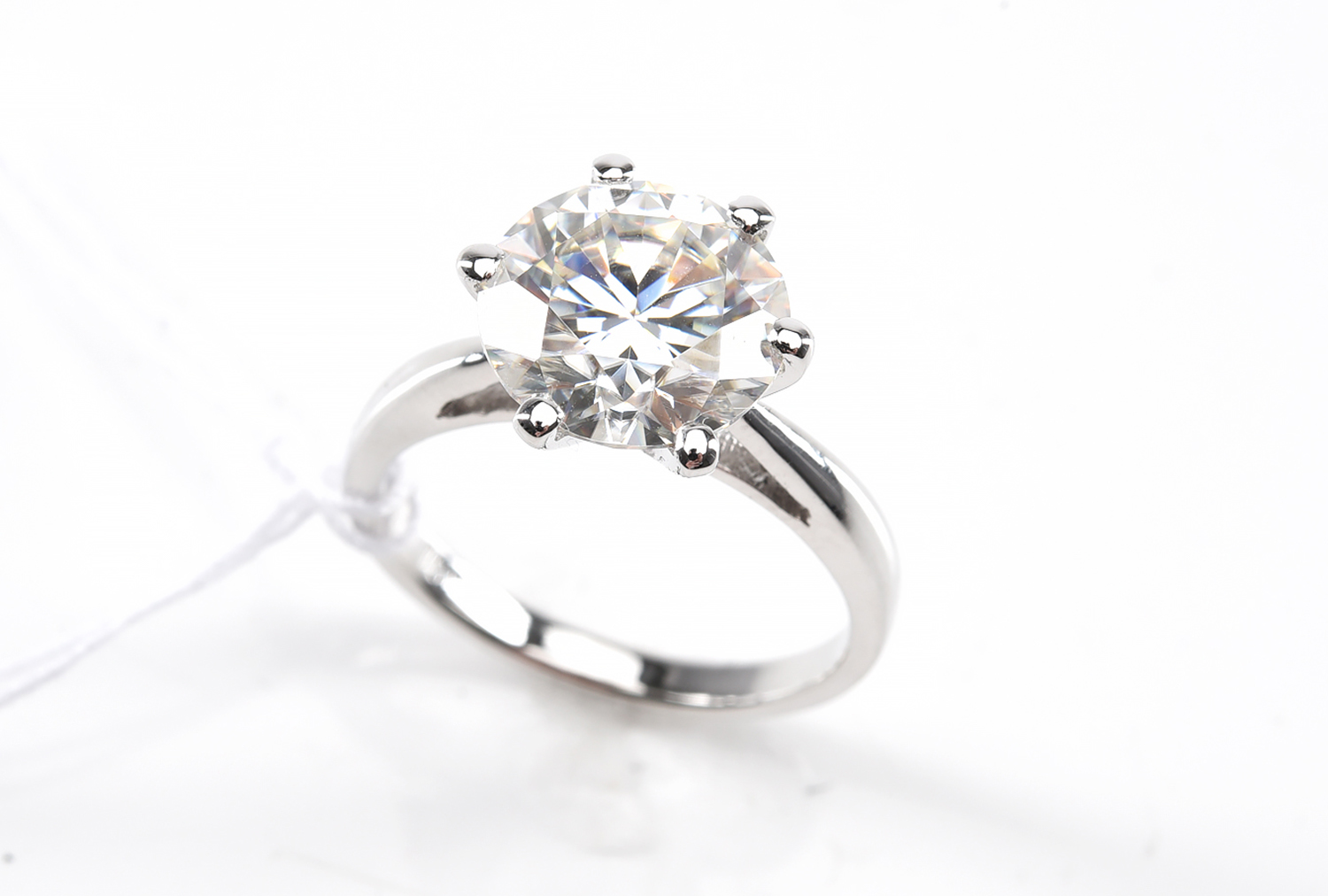 A MOISSANITE SOLITAIRE RING WEIGHING 3.52CTS, IN 18CT WHITE GOLD, SIZE N, 4.4GMS