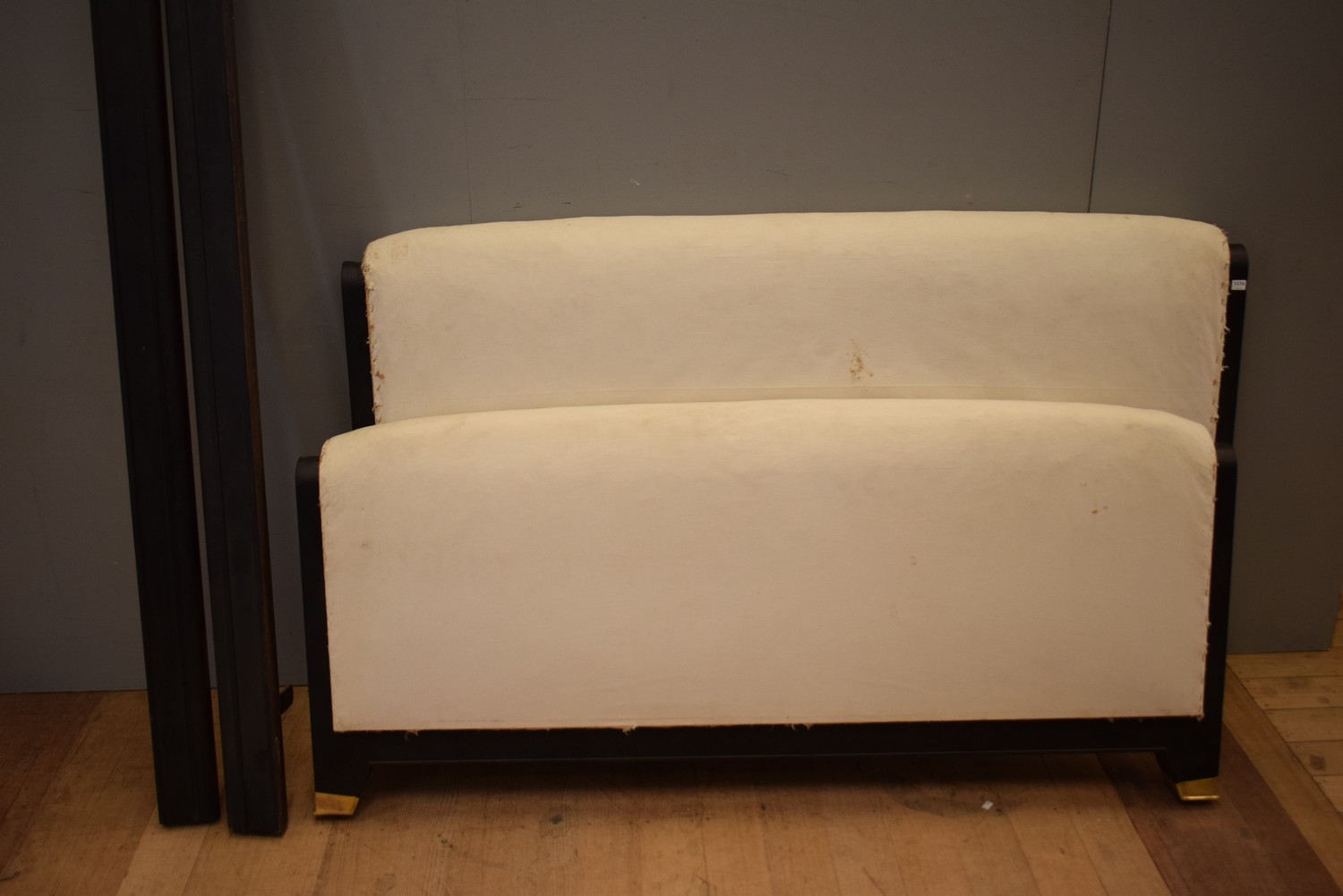 A QUEEN SIZE ART DECO UPHOLSTERED BED WITH RAILS (HEAD 97H X 160W CM)