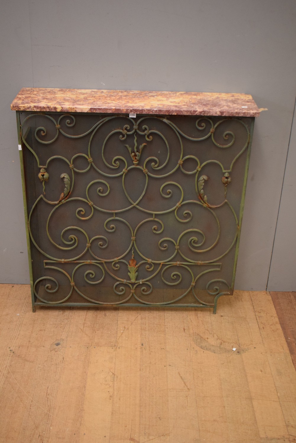 A WROUGHT IRON 1940S MARBLE TOPPED HALL CONSOLE (99H X 95W X 25D CM) (PLEASE NOTE THIS ITEM MUST BE REMOVED BY CLIENTS OR CARRIERS AT THE CUSTOMERS EXPENSE)