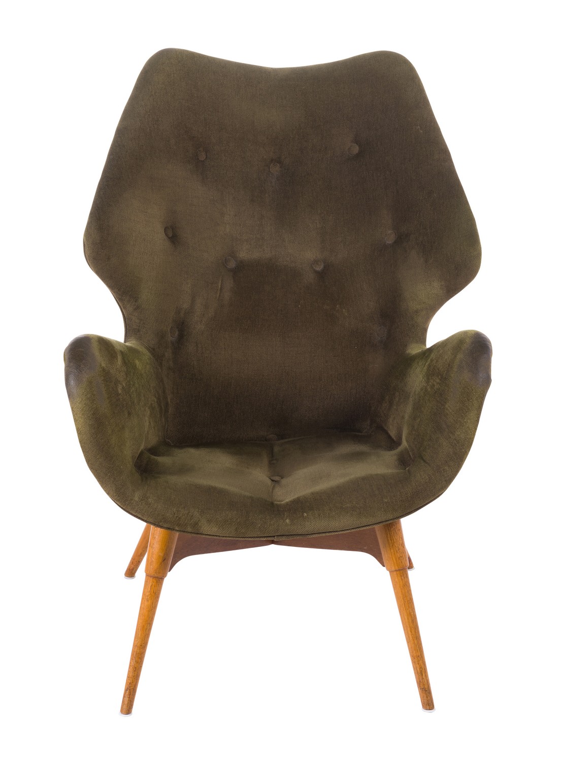 Wear to fabric, especially on arms where upholstery is close to threadbare. Minor marks to wooden base. Repair to legs.