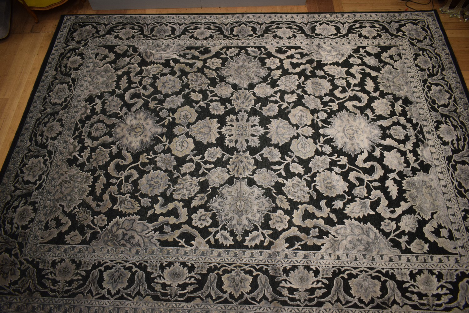 A LARGE DECORATIVE MODERN KASHAN DESIGN CARPET. WOOL & TENCIL SILK TEXTURE. EX-GALLERY STOCK. BRAND NEW AND IN PRISTINE CONDITION. HAND-KNOTTED AND WITH TRADITIONAL DESIGN OF ALL-OVER BOLD EMBOSSED PALMETTES IN MODERN CHARCOAL, SOLVER & GREY TONES. CERTIFICATE OF AUTHENTICITY INCLUDED. SIZE: 396X300CM, ORIGIN: INDIA – RRP: $9,500