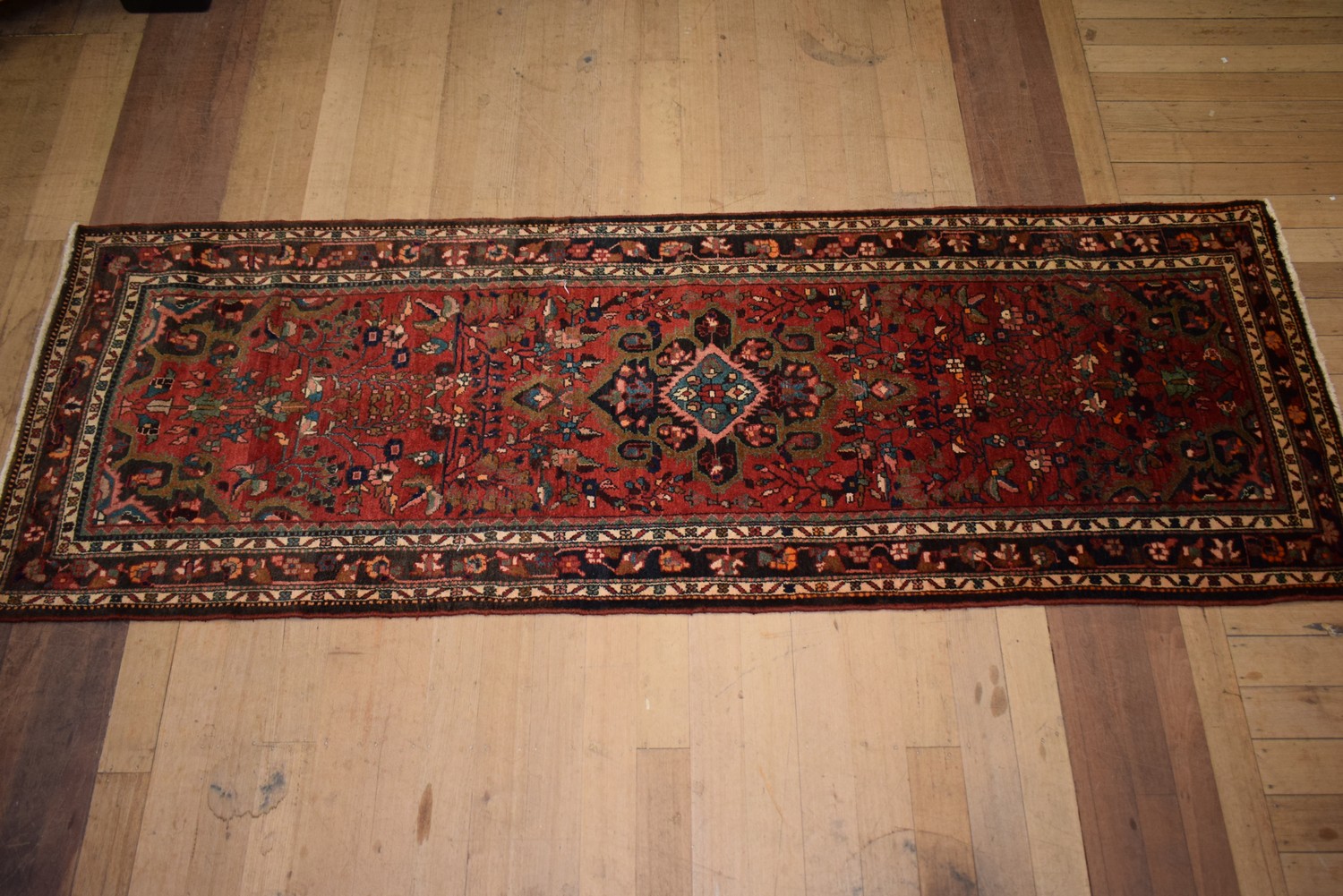 A PERSIAN MEHRABAN HALL RUNNER. 100% WOOL. SOLID & DENSE PILE. IN EXCELLENT CONDITION. HAND-KNOTTED & WITH TRADITIONAL MEHRABAN DESIGN OF CENTRAL MEDALLION SET WITHIN A RED BACKGROUND OF FLORAL SPRAYS. SOLID & HARD-WEARING. CERTIFICATE OF AUTHENTICITY INCLUDED. SIZE: 305X110CM, ORIGIN: PERSIA – RRP: $1,900