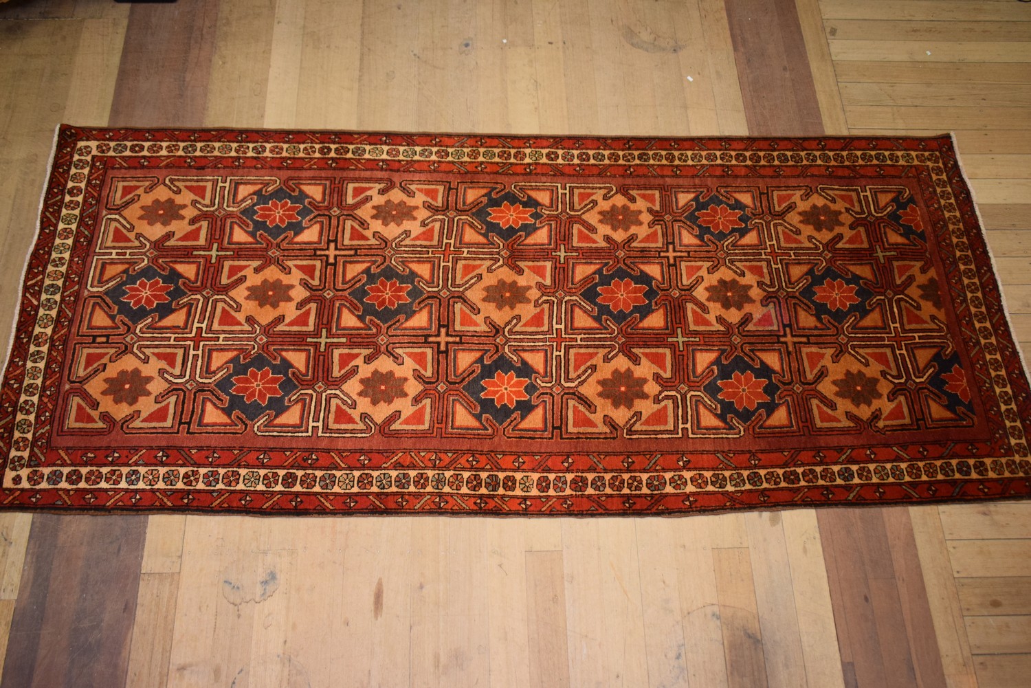 A TRIBAL PERSIAN SONQOR KOLYAIE RUG, 100% WOOL. EX-GALLERY STOCK. IN EXCELLENT CONDITION. HAND-KNOTTED TRIBAL WEAVE AND RARE SONQOR GARDEN DESIGN WITH SYMMETRICAL PANELS CONTAINING FLORAL PATTERNS. BORDER OF FLOWER HEADS. CERTIFICATE OF AUTHENTICITY INCLUDED. SIZE: 300X174CM, ORIGIN: PERSIA – RRP: $3,800
