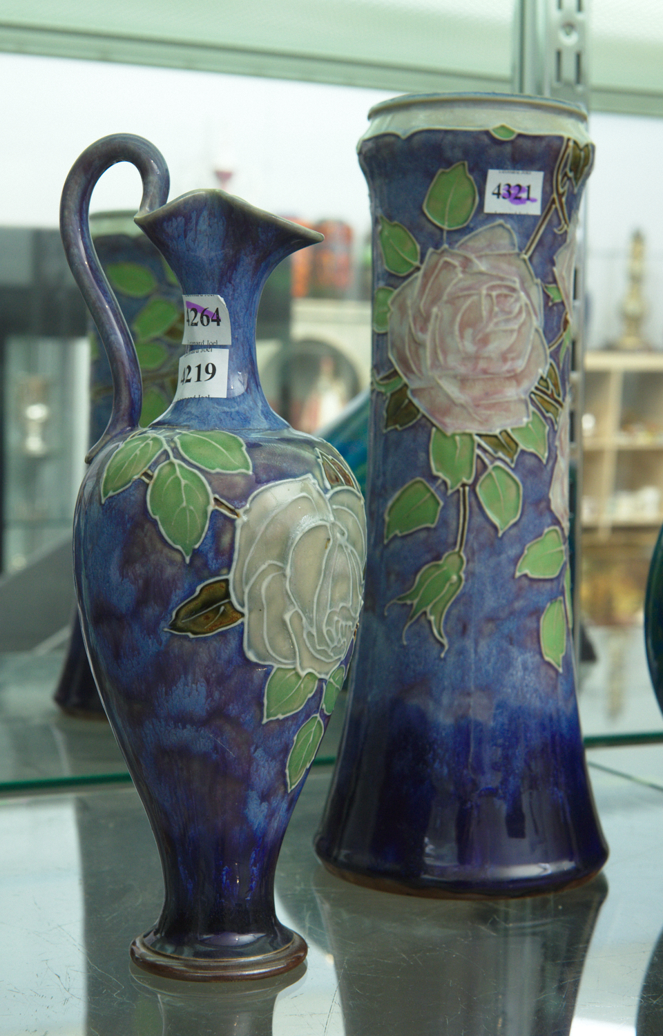 TWO SIMILAR DOULTON BURSLEM ITEMS INCLUDING CYLINDRICAL VASE AND EWER BOTH DECORTAED IN ROSES - VASE H.32.5CM, EWER H.29.5CM