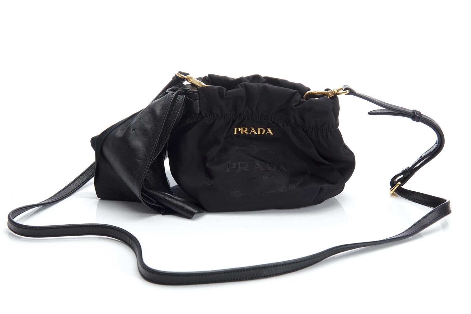 Styled in black nylon and leather with gold metal hardware and detachable black leather strap, 14 x 18 x 8cm.
