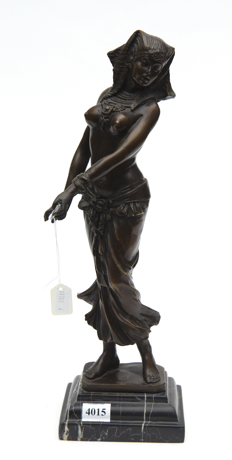 AN EGYPTIANATE BRONZE FIGURE OF A SEMI-DRAPED FEMALE, RAISED ON A STEPPED VEINED MARBLE BASE, 35.5 CM HIGH
