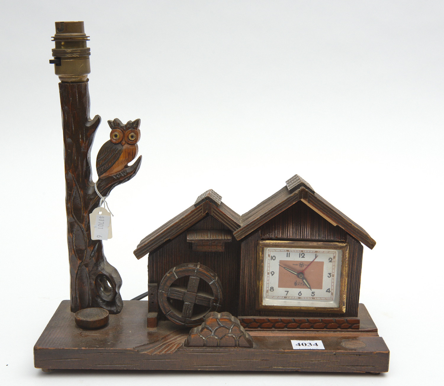 A NOVELTY MUSICAL COMBINATION ALARM CLOCK AND LAMP IN THE FORM A WATERWHEEL AND CABIN, 28 CM WIDE, 27 CM HIGH, 11 CM DEEP