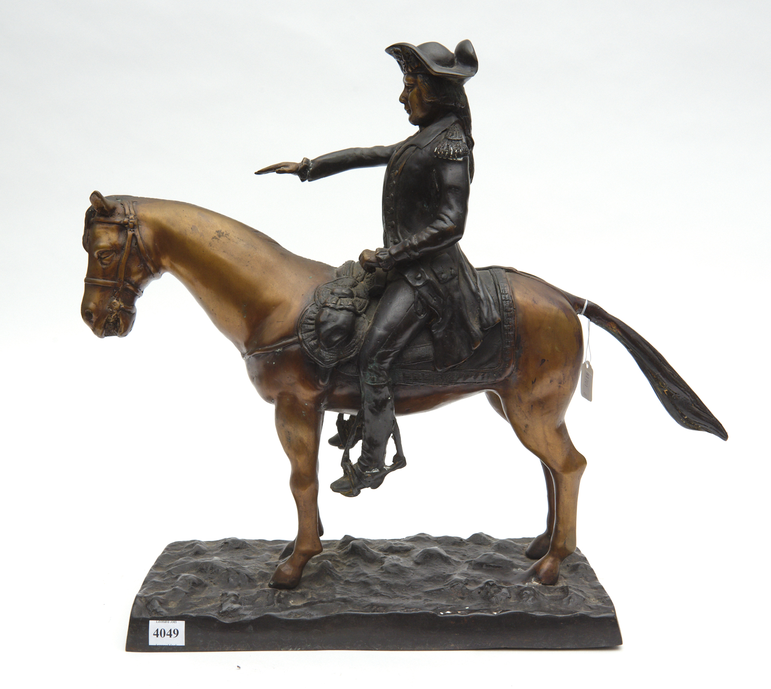 A BRONZE EQUESTRIAN FIGURE GROUP DEPICTING A MOUNTED SOLDIER, RAISED ON A NATURALISTICALLY MODELLED RECTANGULAR BASE, 50 CM WIDE, 42 CM HIGH, 15 CM DEEP