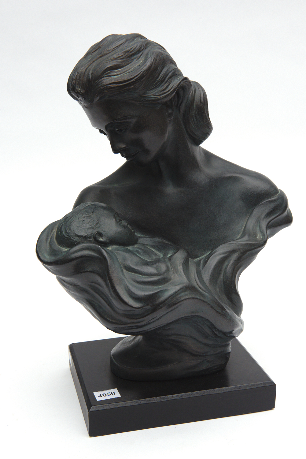 A HEATH AUSTIN RESIN FIGURE OF A MOTHER AND CHILD, RAISED ON A RECTANGULAR EBONISED WOODEN BASE, MOULDED SIGNATURE 'HEATH' AND STAMPED 'AUSTIN / SCULPTURE' 'c 1991', 39 CM HIGH