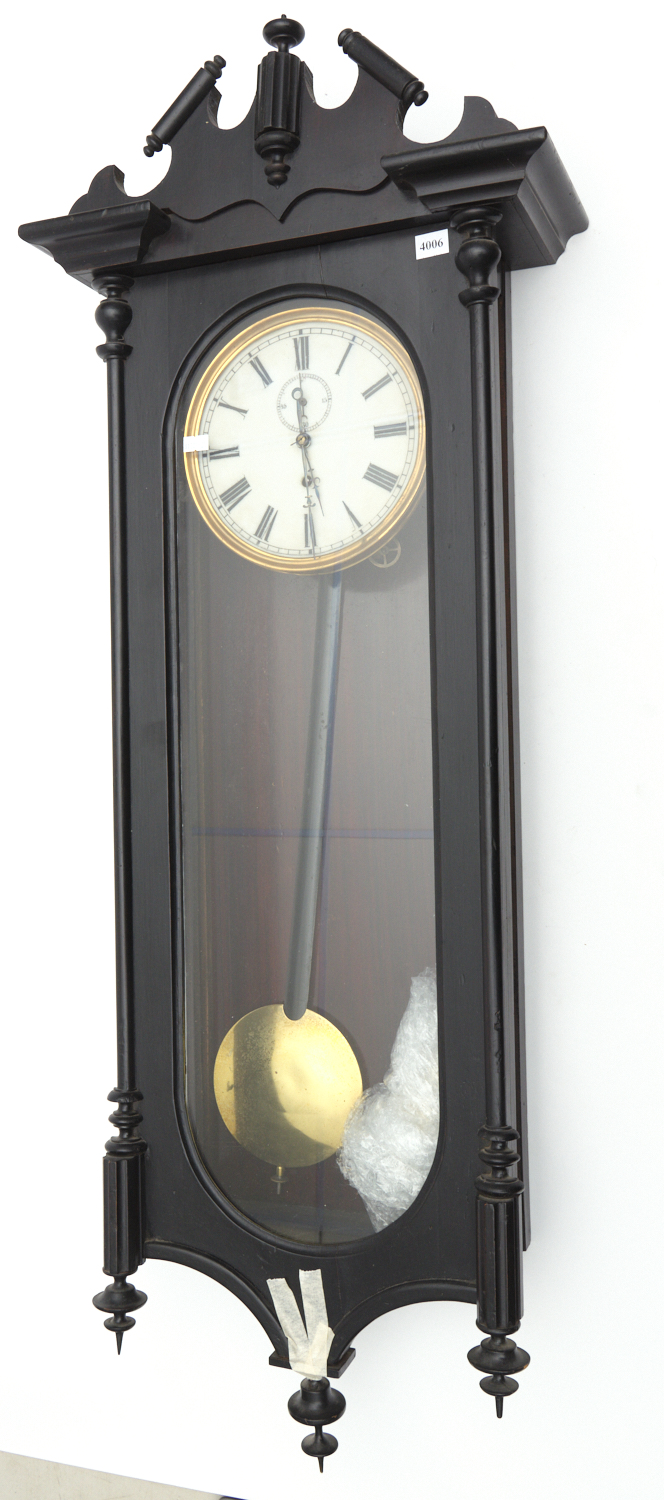 A VIENNA REGULAR WALL CLOCK WITH AN EBONISED CASE, WITH PENDULUM, WEIGHT AND TWO WINDERS, 112 CM HIGH (repairs and losses)