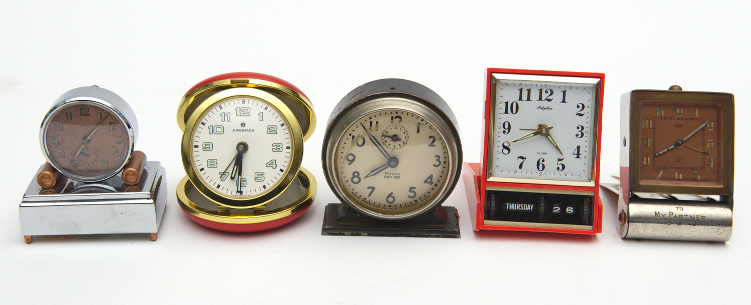 FIVE VINTAGE ALARM CLOCKS, INCLUDING A STAINLESS STEEL CASED SWISS REVILLE TUNE CLOCK, A JAPANESE 'RHYTHM' ALARM CLOCK WITH CALENDAR, A WESTCLOX 'BABY BEN' ALARM CLOCK AND A JAEGAR TRAVELLING ALARM CLOCK INSCRIBED 'TO / MY PARTNER / 15.3.49'