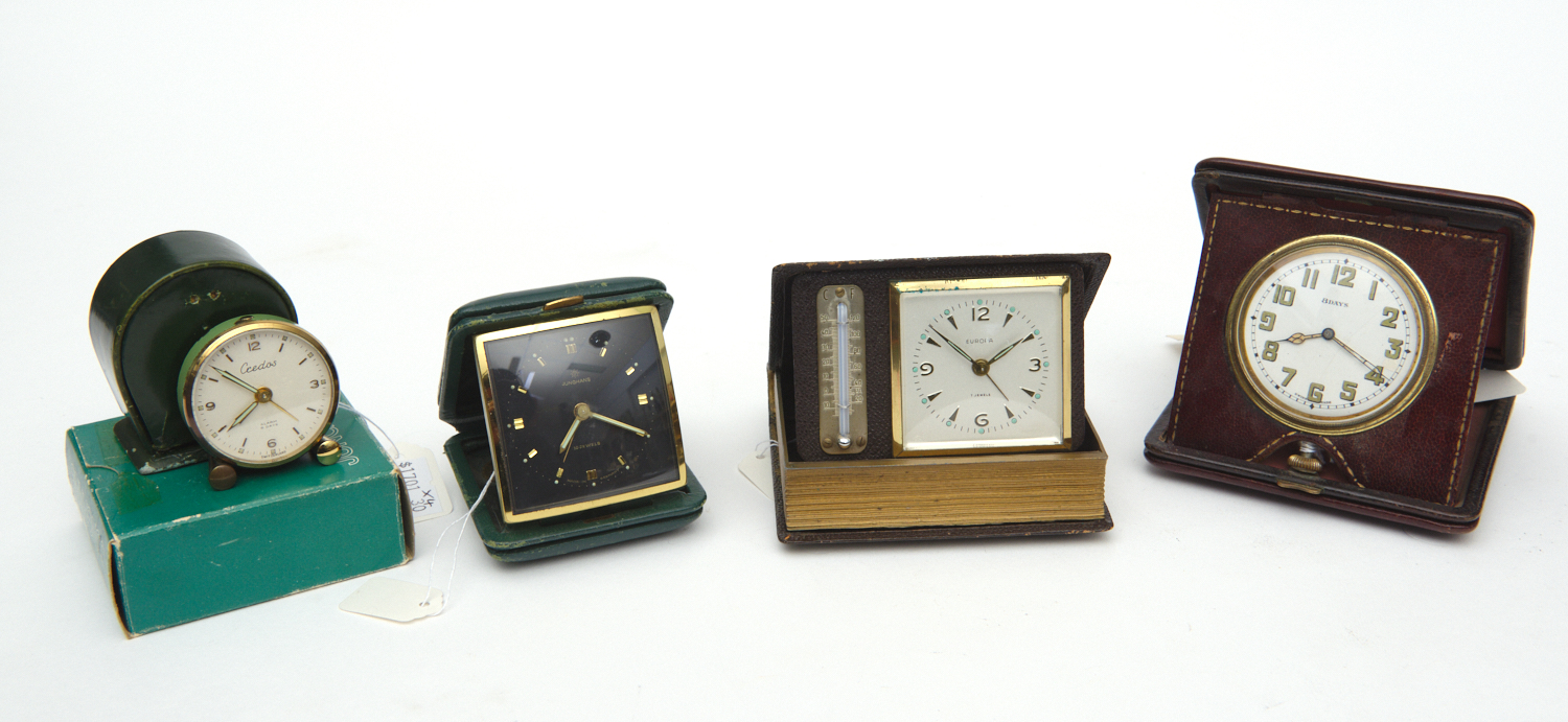 FOUR VINTAGE TRAVEL ALARM CLOCKS, INCLUDING A CREDOS ALARM CLOCK WITH A GREEN ENAMEL BODY IN A GREEN LEATHER CASE, A JUNGHANS GERMAN 8-DAY ALARM CLOCK IN A HINGED LEATHER MOUNTED CASE WITH ITS ORIGINAL BOX, A SWISS 8-DAY ALARM CLOCK IN A HINGED LEATHER MOUNTED TRAVEL CASE AND A EUROPA NOVELTY ALARM CLOCK WITH A TRAVEL CASE IN THE FORM OF A BOOK