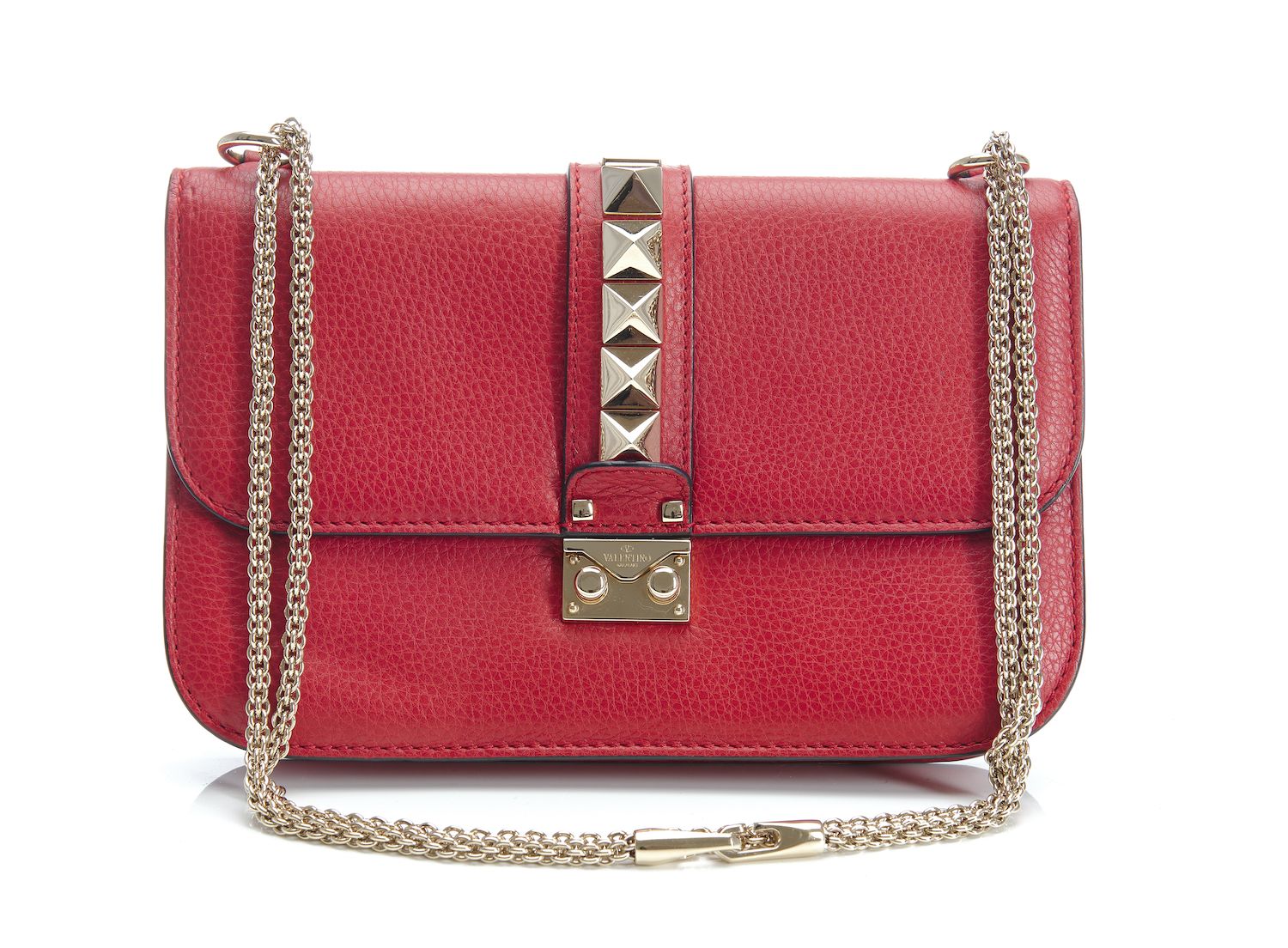 Styled in red leather with gold metal hardware and detachable chain strap, 17 x 26 x 5cm