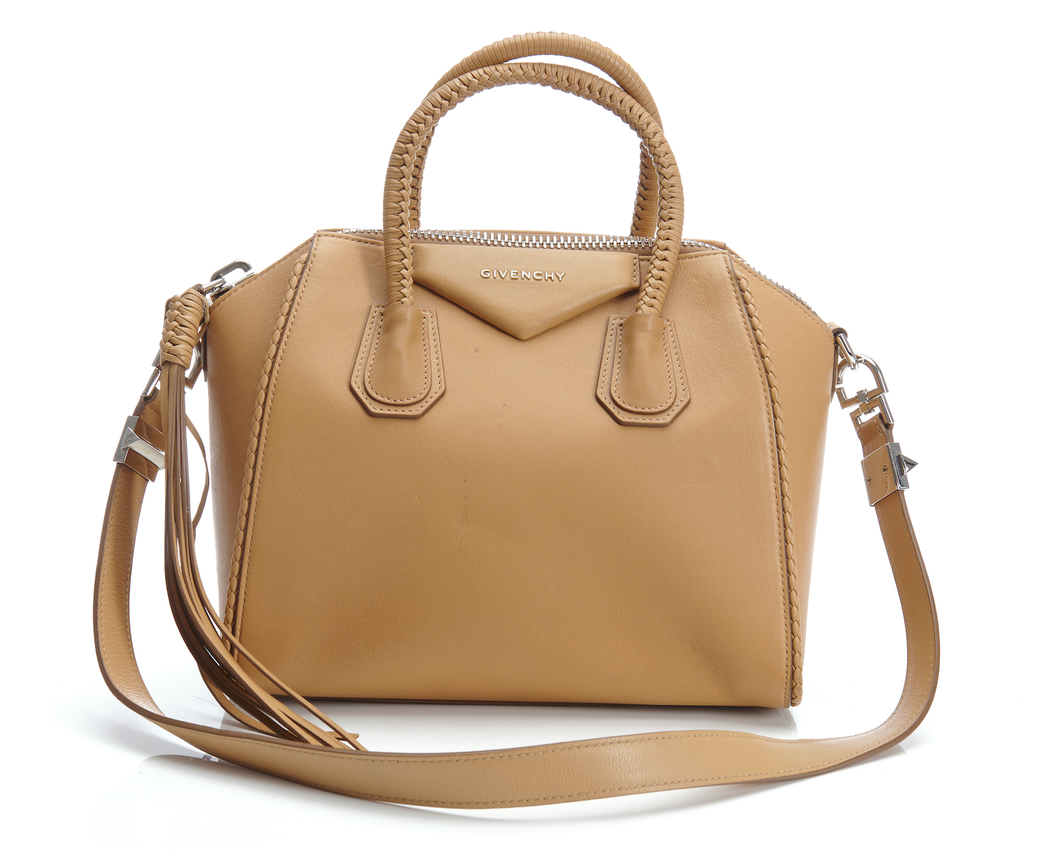 Styled in camel leather with silver metal hardware and detachable shoulder strap, 23 x 28 x 12cm.
