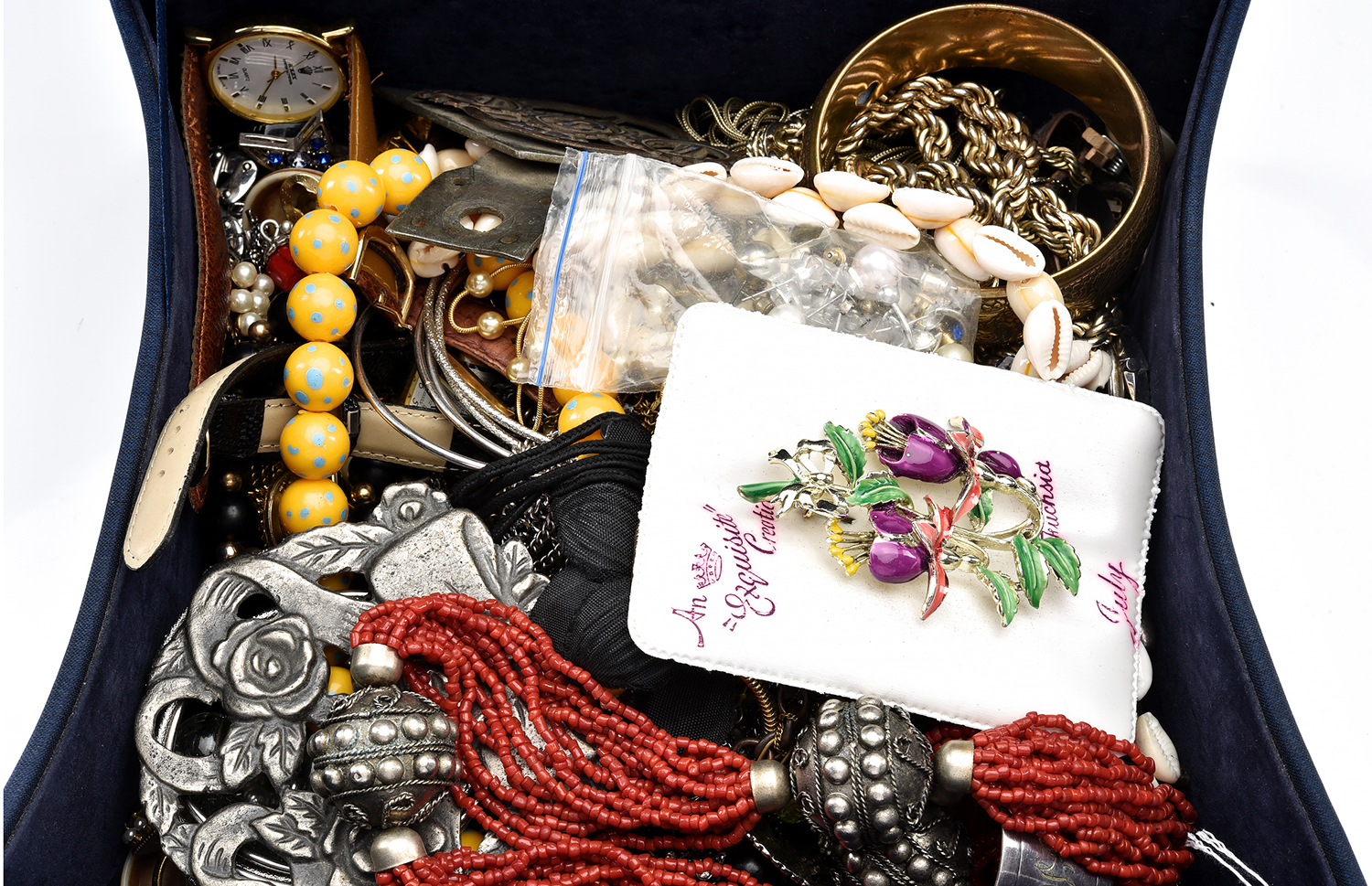 A BOX OF COSTUME JEWELLERY INCLUDING ETHNIC CORAL AND SILVER NECKLACE.