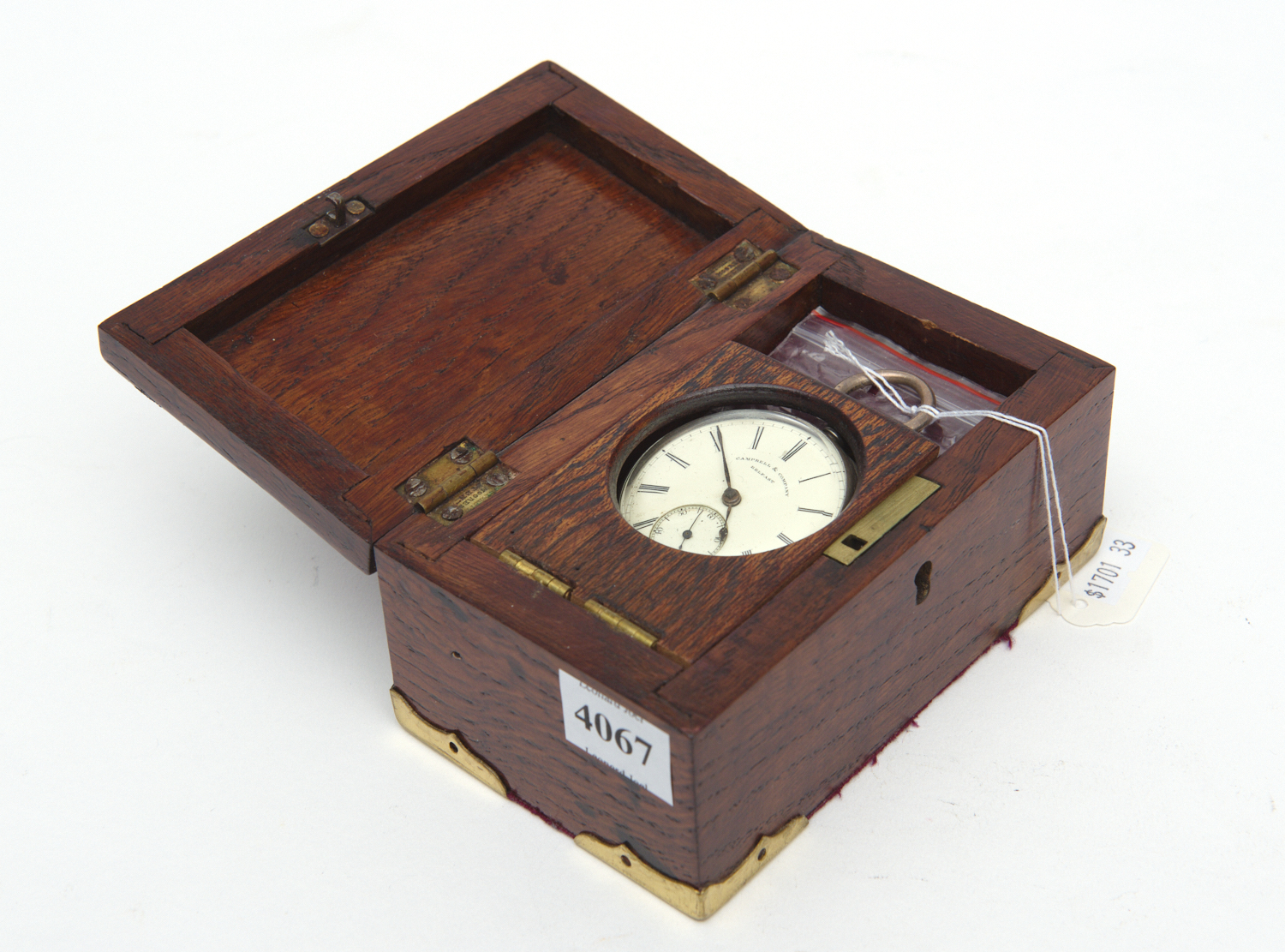 A STERLING SILVER CASED POCKET WATCH, THE DIAL SIGNED CAMPBELL & COMPANY, BELFAST, HOUSED WITHIN A LATER HARDWOOD CASE INSCRIBED TO THE COVER 'CAMPBELL & COMPANY / BELFAST. NI. / REG NO 54425', THE DIAL 44 MM DIAMETER, THE CASE 12.5 CM WIDE, 6 CM HIGH, 7.5 CM DEPTH, WITH WINDER AND KEY FOR CASE