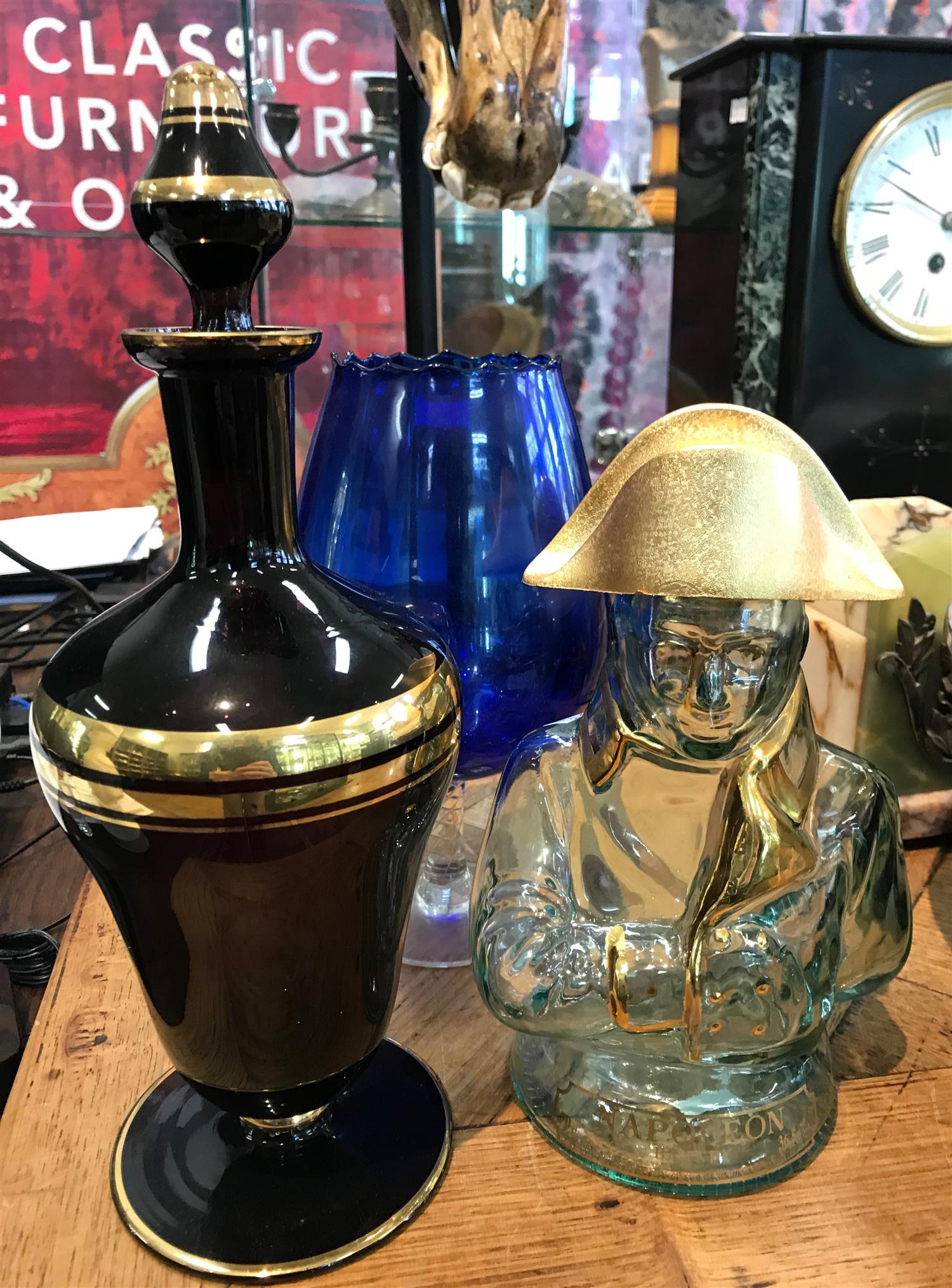 THREE PIECES OF GLASS, INCLUDING A FIGURAL NAPOLEON BRANDY BOTTLE, A LARGE BLUE AND CLEAR GLASS GOBLET AND A GILDED AMETHYST GLASS DECANTER WITH STOPPER, THE DECANTER 30 CM HIGH