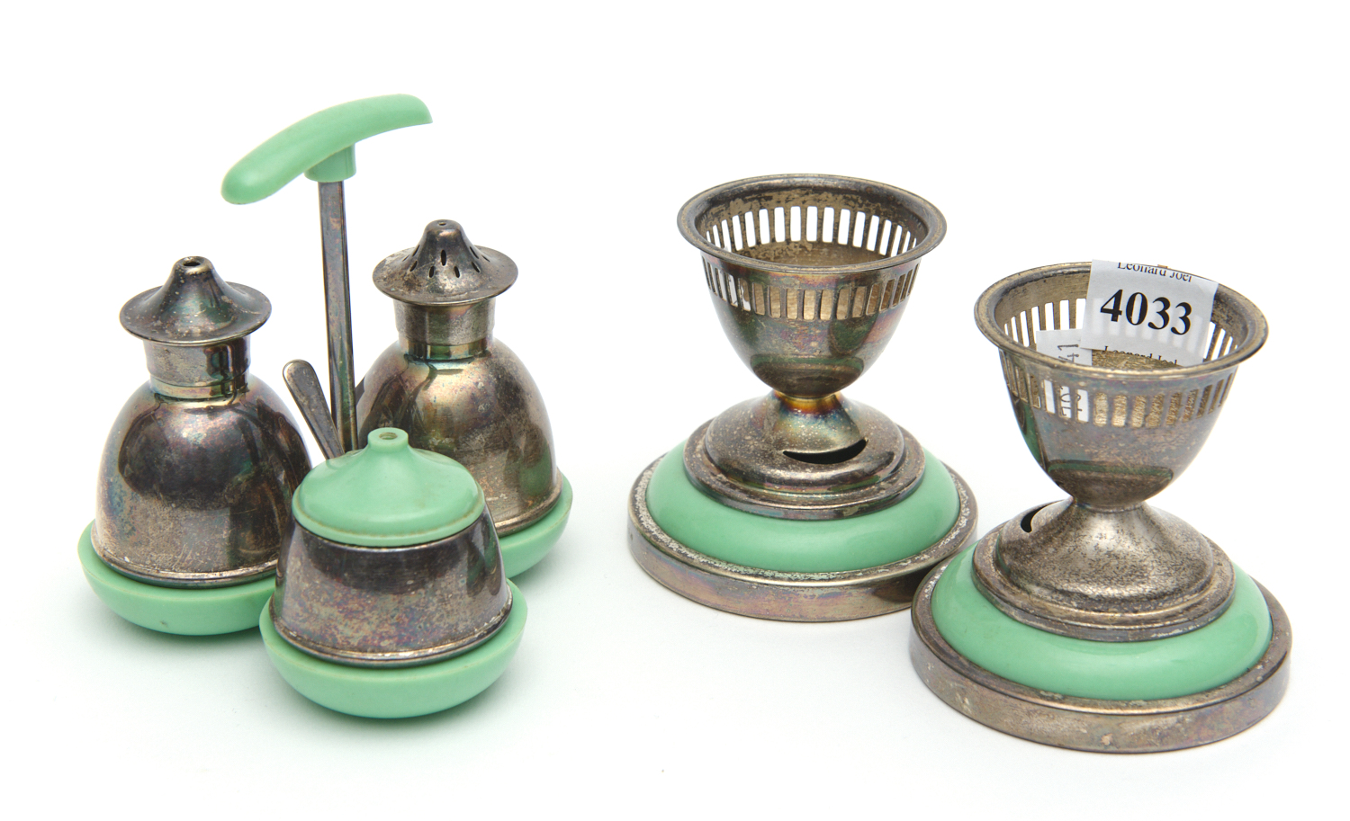 A LEWBURY BAKELITE AND EPNS CRUET SET, COMPRISING A CRUET STAND WITH A MUSTARD POT, SALTSHAKER AND PEPPER SHAKER AND TWO EGG CUPS
