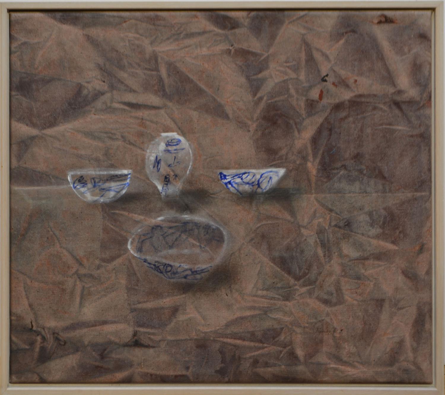 RICHARD DUNLOP, STILL LIFE WITH JOE'S POTS 2001, OIL ON CANVAS, 45 X 50CM, FRAME SIZE: 47 X 53CM, CONDITION: GOOD