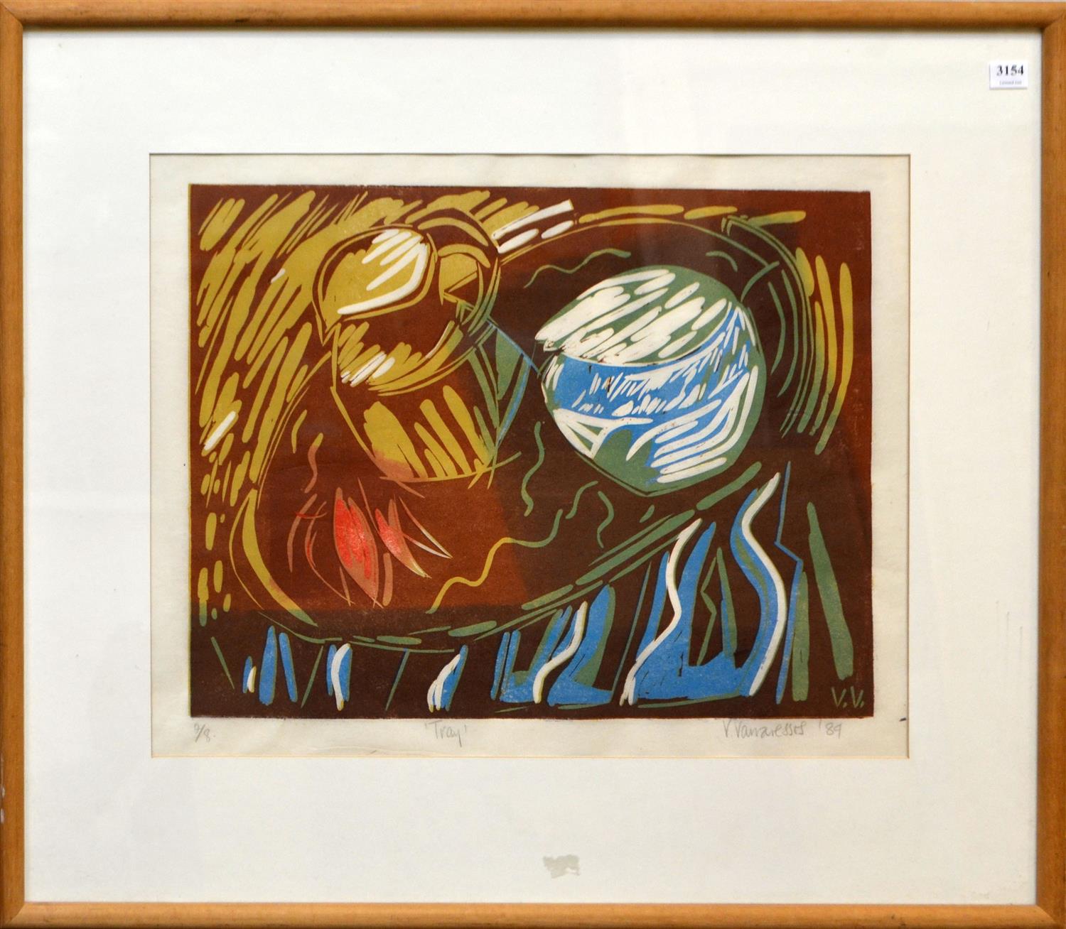 VICKI VARVARESSOS, TRAY 4, COLOUR LINOCUT 2/8, 36 X 46CM, FRAME SIZE: 62 X 71CM, CONDITION: SLIGHT COCKLING TO PAPER, DISCOLOURATION