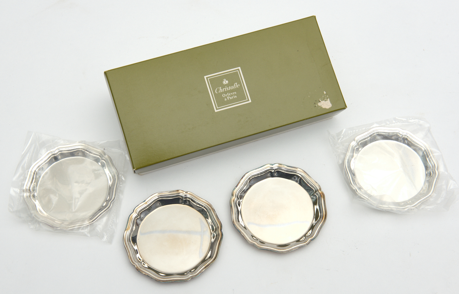 A SET OF FOUR CHRISTOFLE SILVER PLATE COASTERS, BOXED