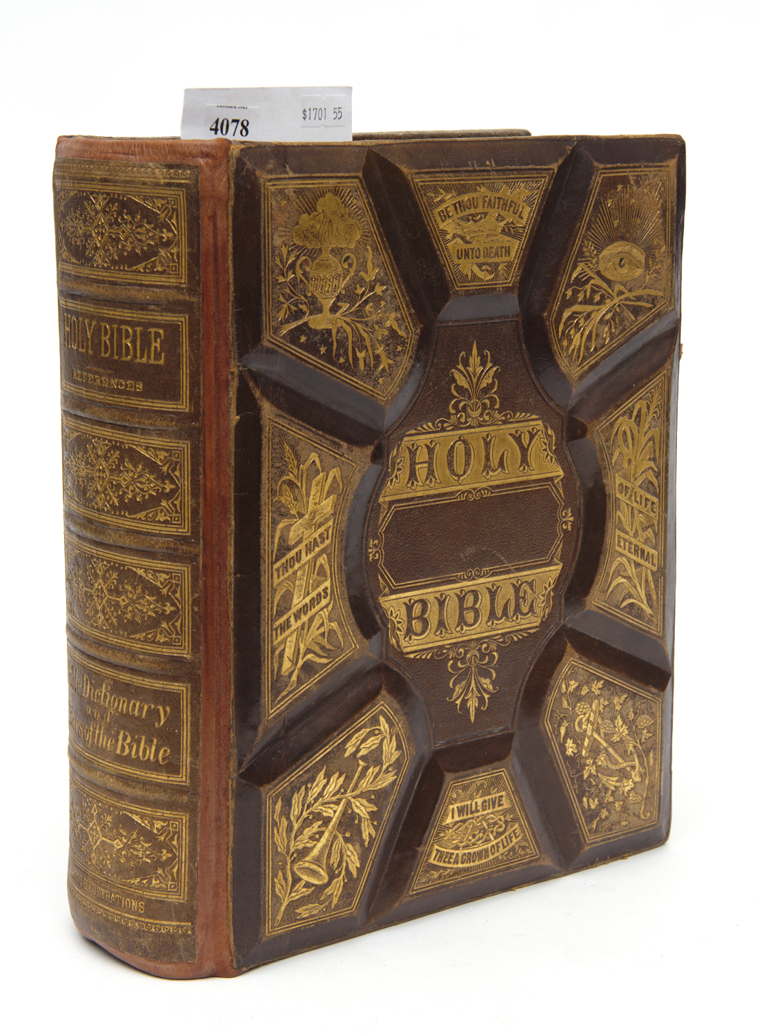 A COPY OF THE LATER ILLUSTRATED FAMILY BIBLE, PUBLISHED 1881, WITH A RICHLY TOOLED, GILT AND EMBOSSED LEATHER COVER, 33 CM HIGH