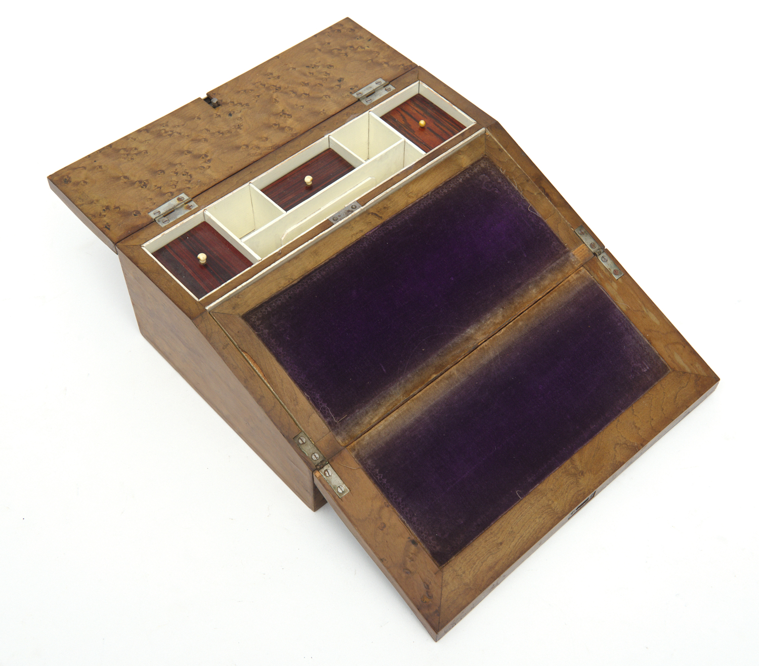 A BIRDSEYE MAPLE VENEERED WRITING COMPENDIUM WITH PEWTER INLAY, 28 CM WIDE, 11.5 CM HIGH, 20 CM DEPTH