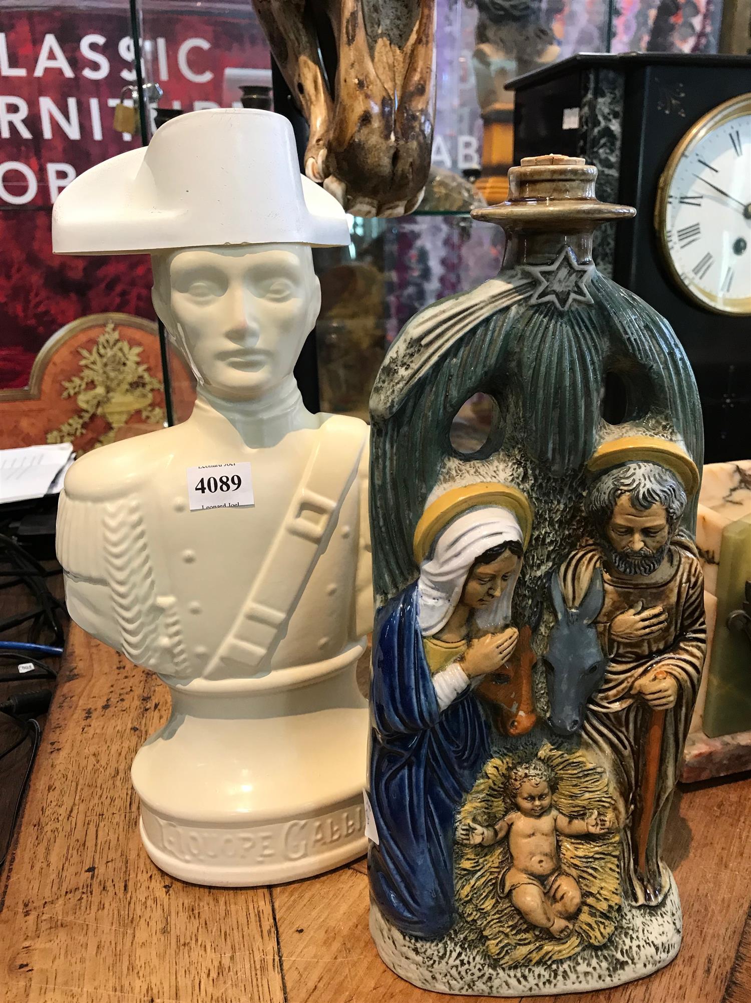 TWO NOVELTY ALCOHOL CONTAINERS, INCLUDING ONE IN RESIN DEPICTING A NATIVITY SCENE, THE OTHER A CERAMIC BOTTLE FOR GALLIANO, MODELLED IN THE FORM OF NAPOLEON, THE TALLEST 32 CM HIGH