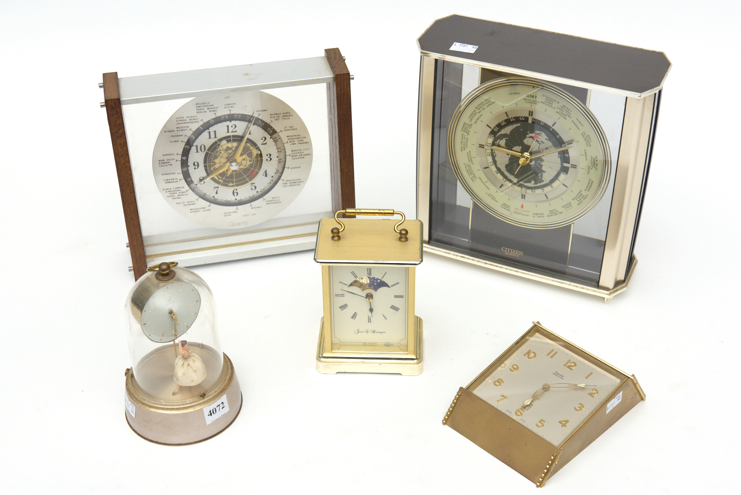 FIVE VINTAGE DESK CLOCKS, INCLUDING A JUNGHANS MUSICAN BALLERINA CLOCK WITH PERSPEX DOME, A JAMES G. HUNTINGTON ALARM CLOCK, A SWIZA ALARM CLOCK AND A QUARTZ DESK CLOCK WITH A HARDWOOD AND BRUSHED ALUMINIUM CASE, AND A CITIZEN QUARTZ WORLD TIME CLOCK