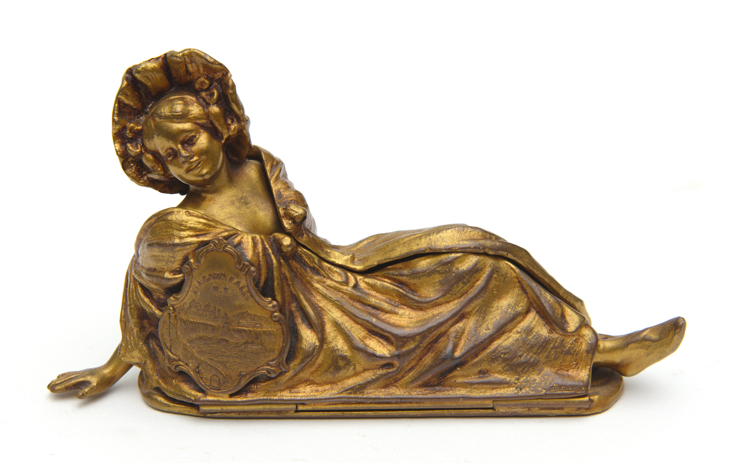 A GILT BRONZE EROTIC REVEAL FIGURE, MODELLED AS A FEMALE IN A FLOWING DRESS, SUPPORTING A SHIELD INSCRIBED 'NIAGARA FALLS / N.Y.', THE DRESS HINGED TO THE CENTRE, TO REVEAL THE WOMAN SEMI-CLAD, 14 CM WIDE