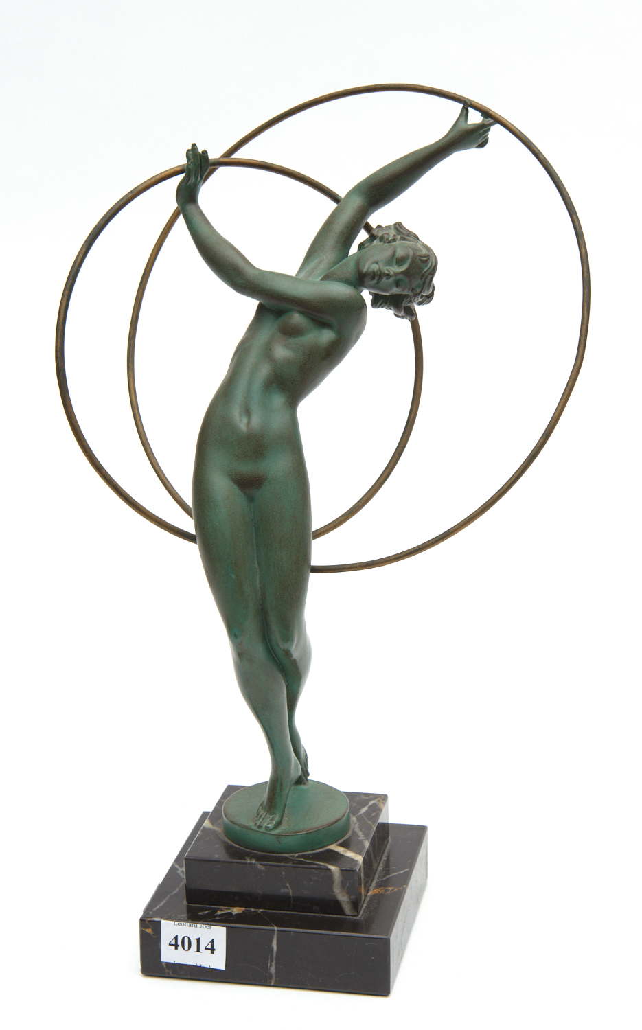 A PATINATED BRONZE FIGURE OF A FEMALE NUDE HOOP DANCER, RAISED ON A SQUARE STEPPED MARBLE BASE, 33 CM HIGH