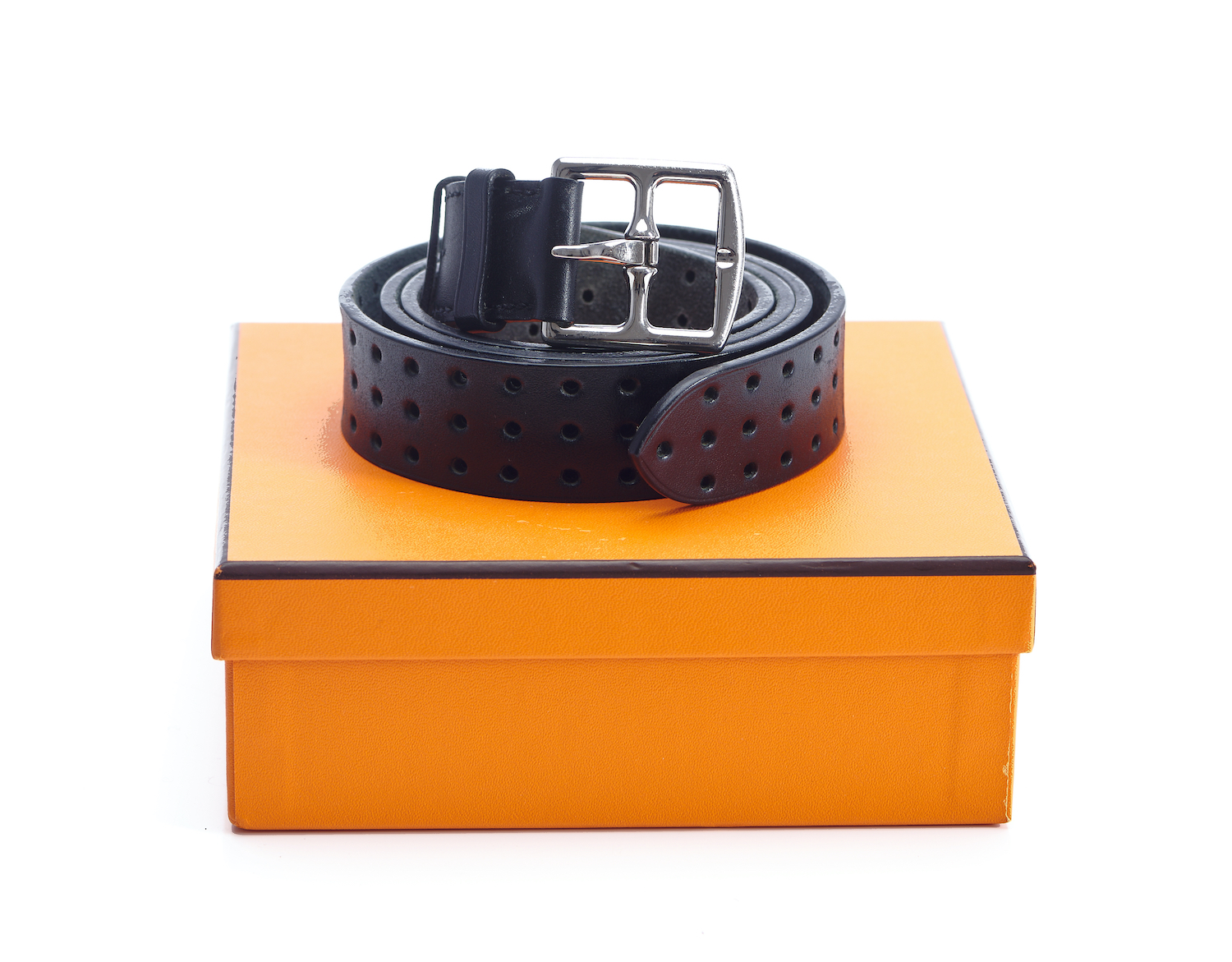 Styled in black leather with punched hole design and silver metal buckle, labelled size 100, boxed.