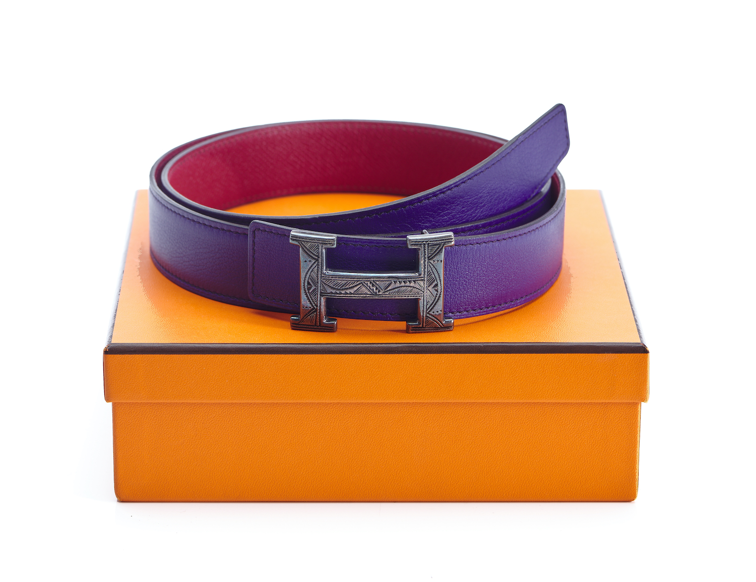 Styled in purple leather with cerise leather to reverse, with sterling silver 'H' buckle, labelled size 100, boxed.