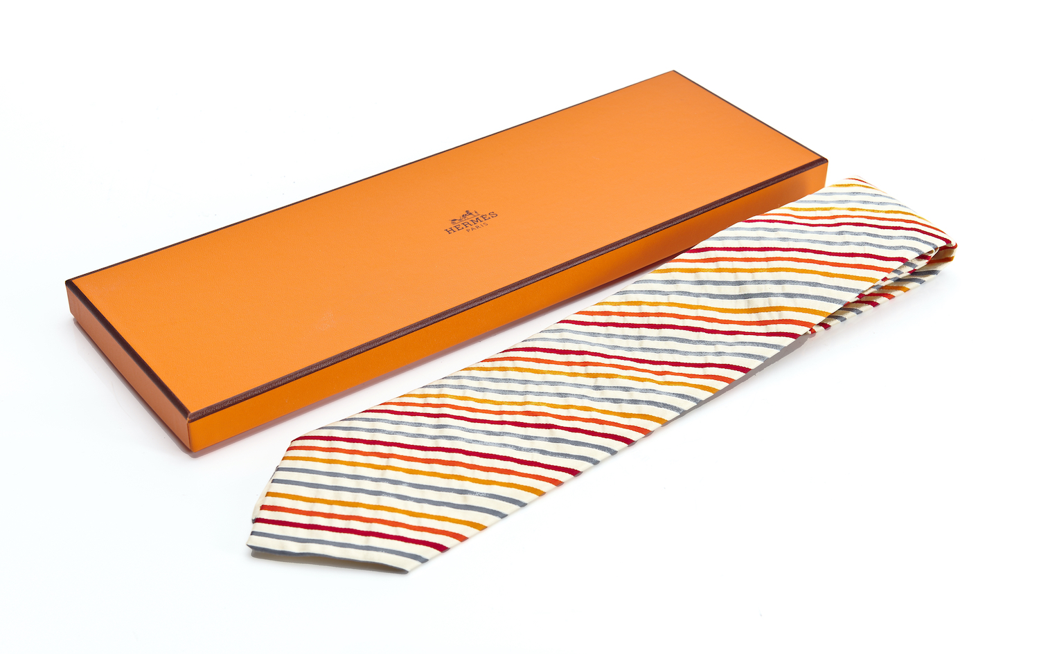 The seersucker tie, style with orange, red and grey diagonal stripes on a cream background. boxed.
