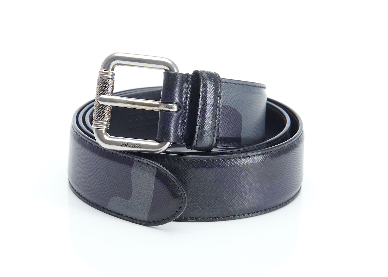 Styled in grey and black camouflage printed leather, with black leather to reverse and silver metal buckle, labelled size 38 /95.
